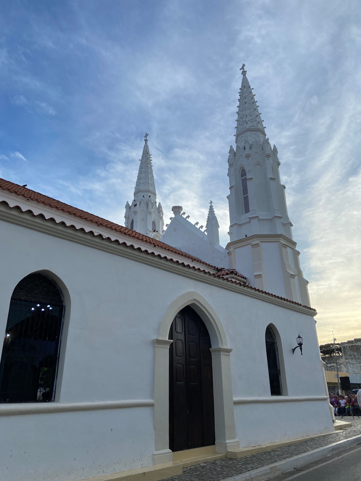 The image shows the Iglesia de San Juan Evangelista, a Roman Catholic church in Juan Griego, Venezuela. The angle is a low shot looking up, emphasizing the white church's architecture against a blue,…read more