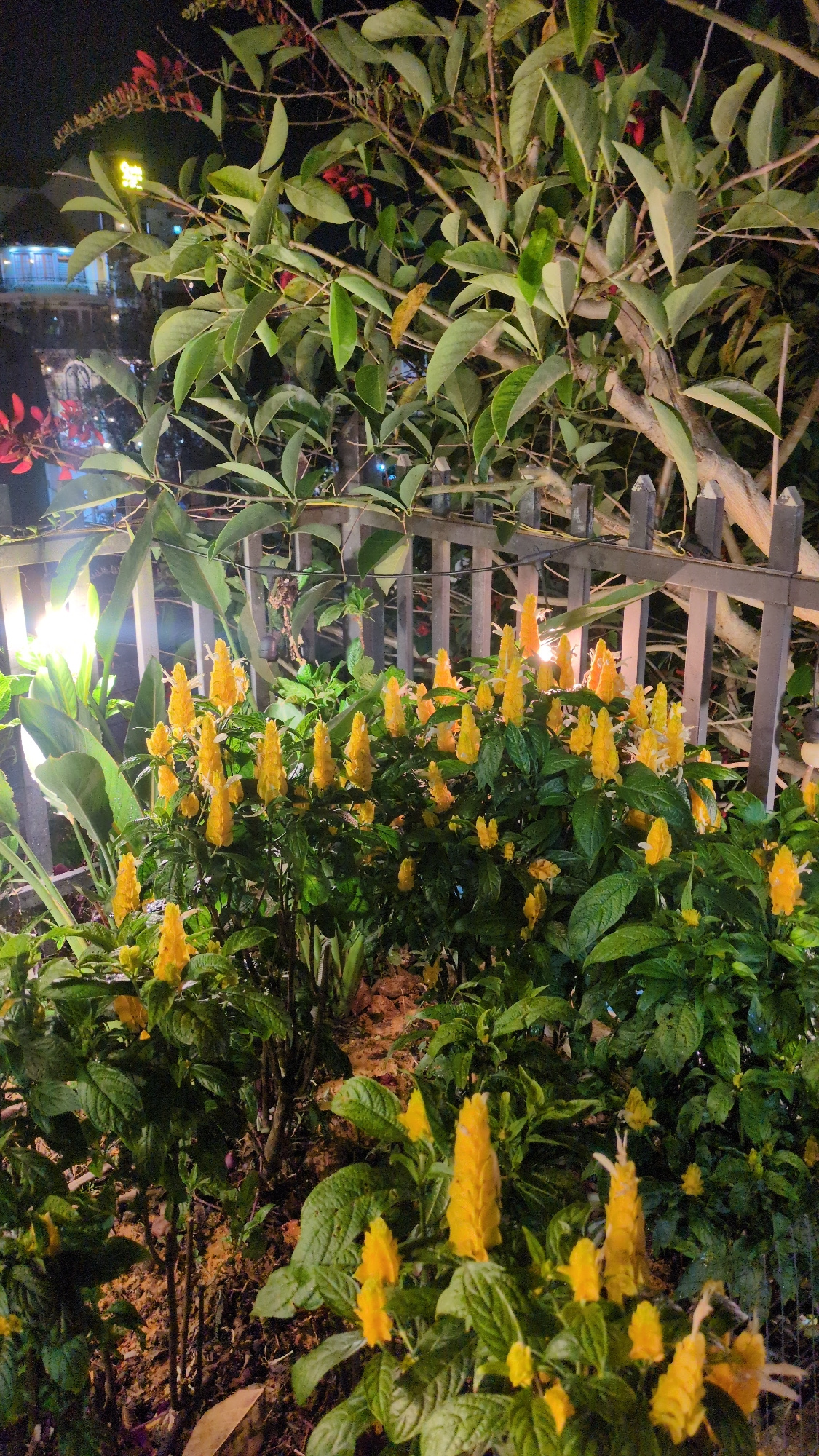 The image shows a trellis overgrown with plants, possibly in Da Lat, Vietnam. The left side features a plant with long, slender leaves and red flowers, while the right side has a plant with yellow, co…read more