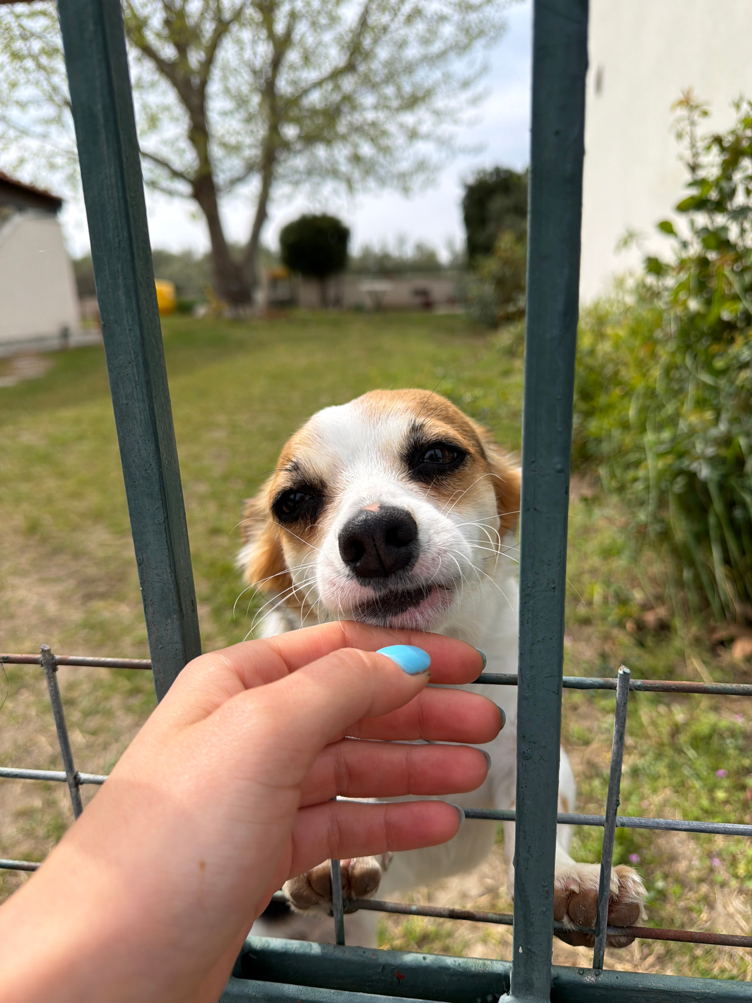 A medium shot depicts a dog interacting with a person's hand through a metal fence. The dog is primarily white with brown patches around its ears and a black nose. It is looking directly at the camera…read more