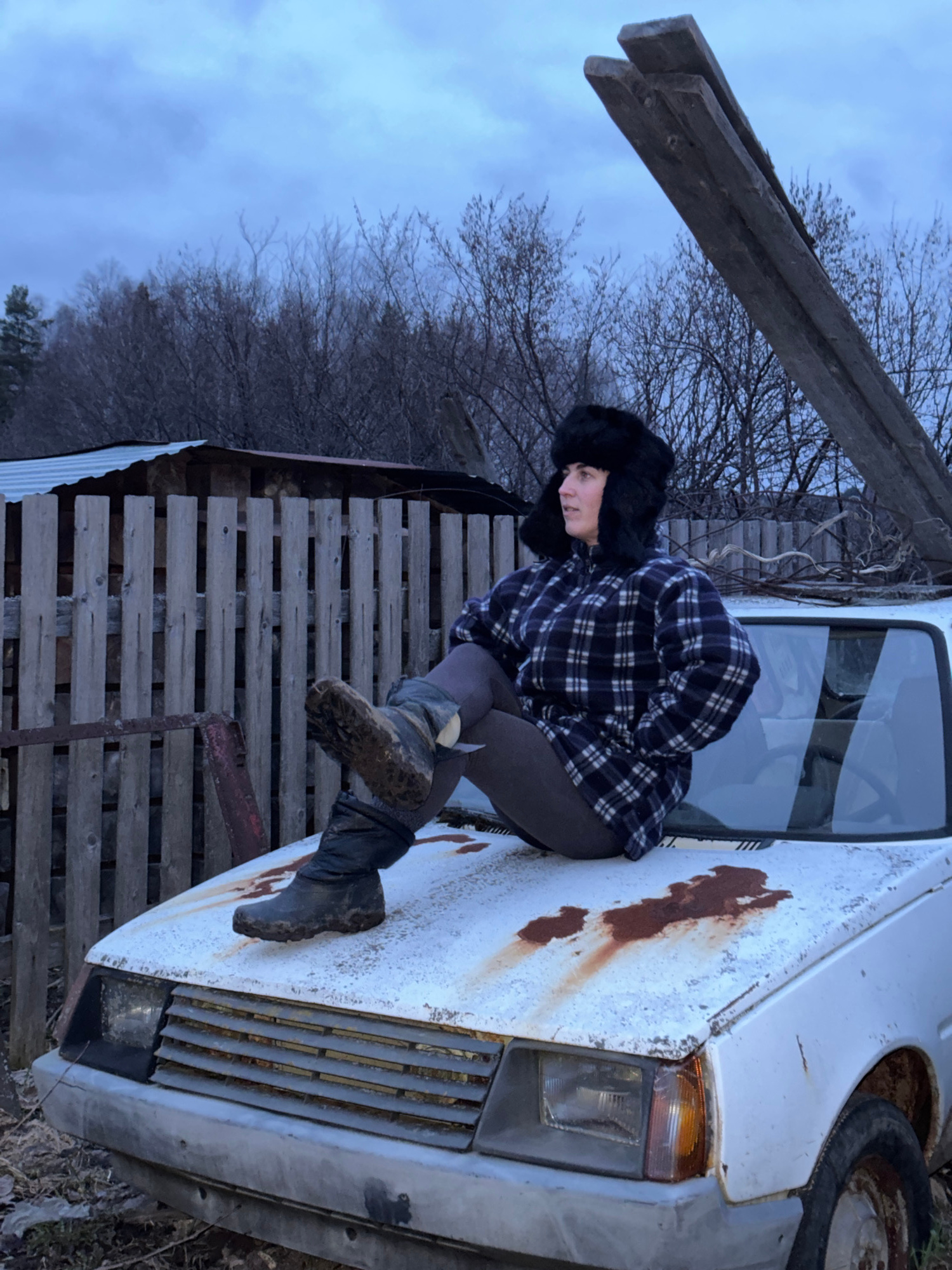 An outdoor portrait captures a person sitting on the heavily rusted white hood of an old, derelict car in what appears to be Вассята, Russia. The person, likely a young woman, is dressed for cold weat…read more