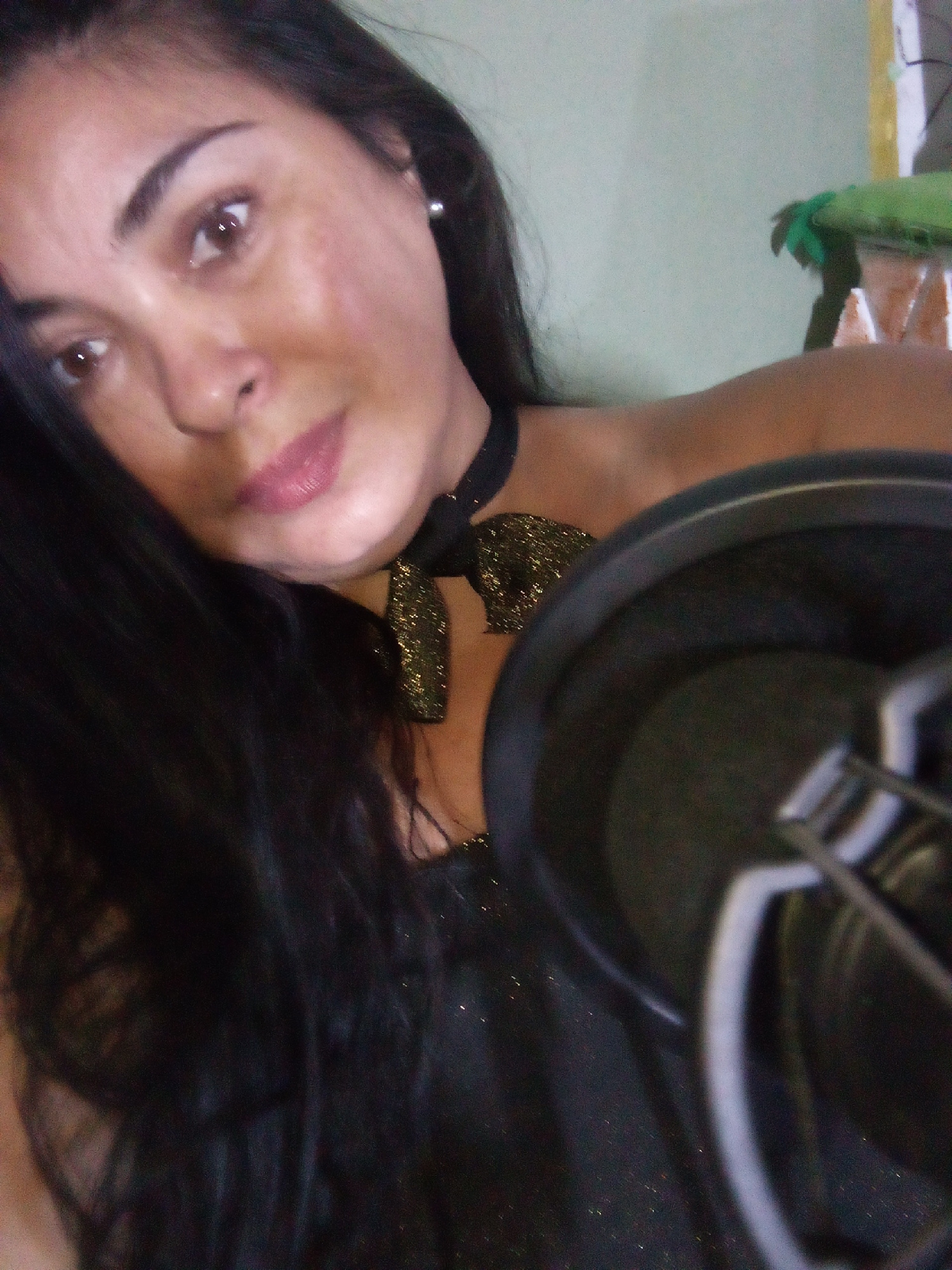 A medium shot captures a woman with dark hair leaning towards a microphone. She has brown eyes and pink lips. She's wearing a black top with gold glitter and a matching bow choker. A microphone with a…read more