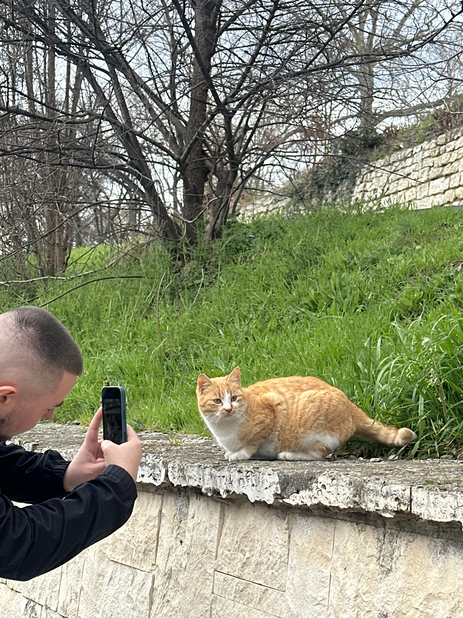A man is taking a photo of an orange and white cat. The man is wearing a black jacket and has a shaved head. He is holding a dark-colored smartphone to take the photo. The cat is lying on a stone wall…read more