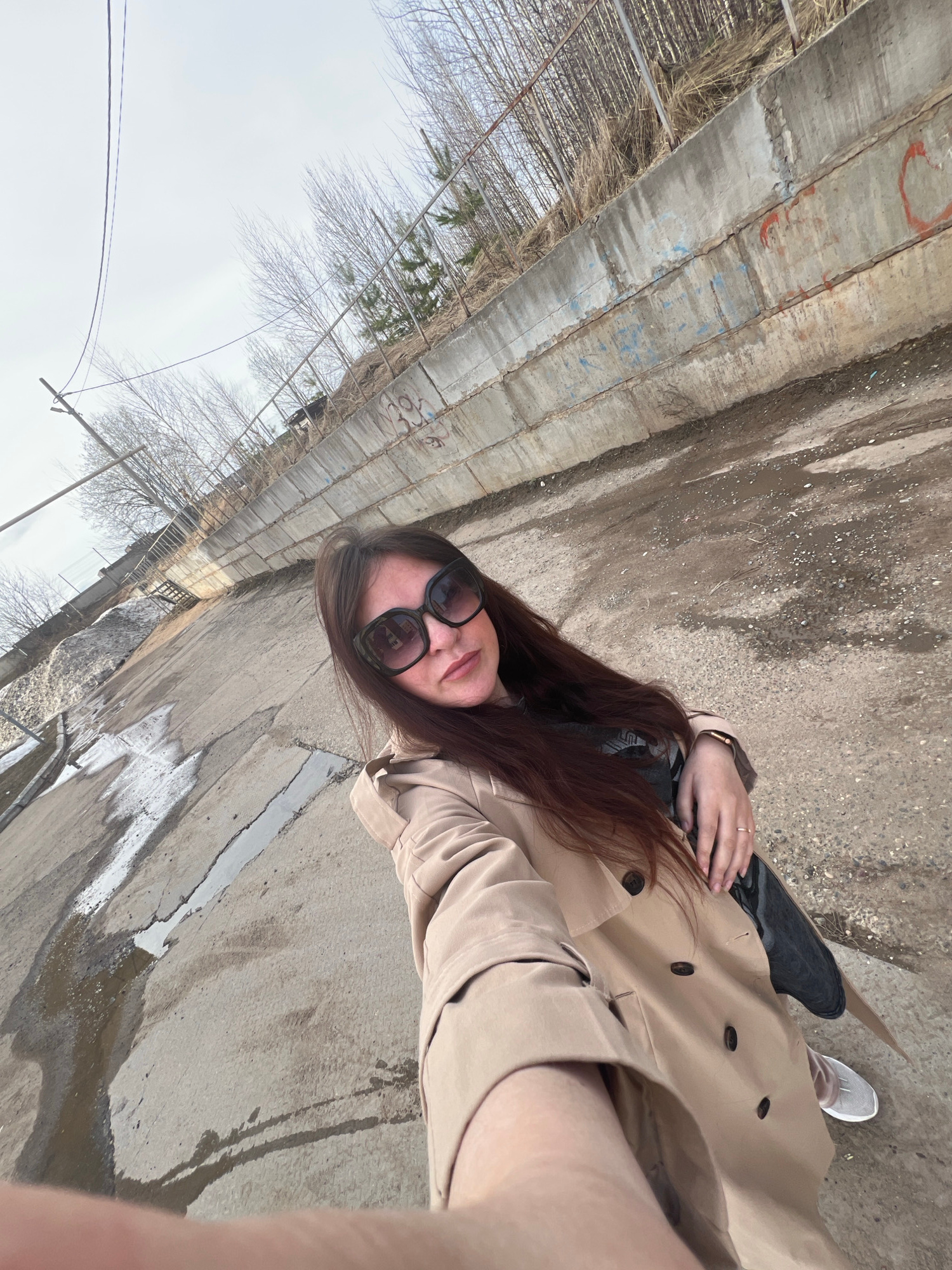 A woman with long brown hair and sunglasses is lying on a concrete surface. She wears a beige trench coat, black jeans, and a light gray shoe. The surface is cracked and stained, possibly from water o…read more