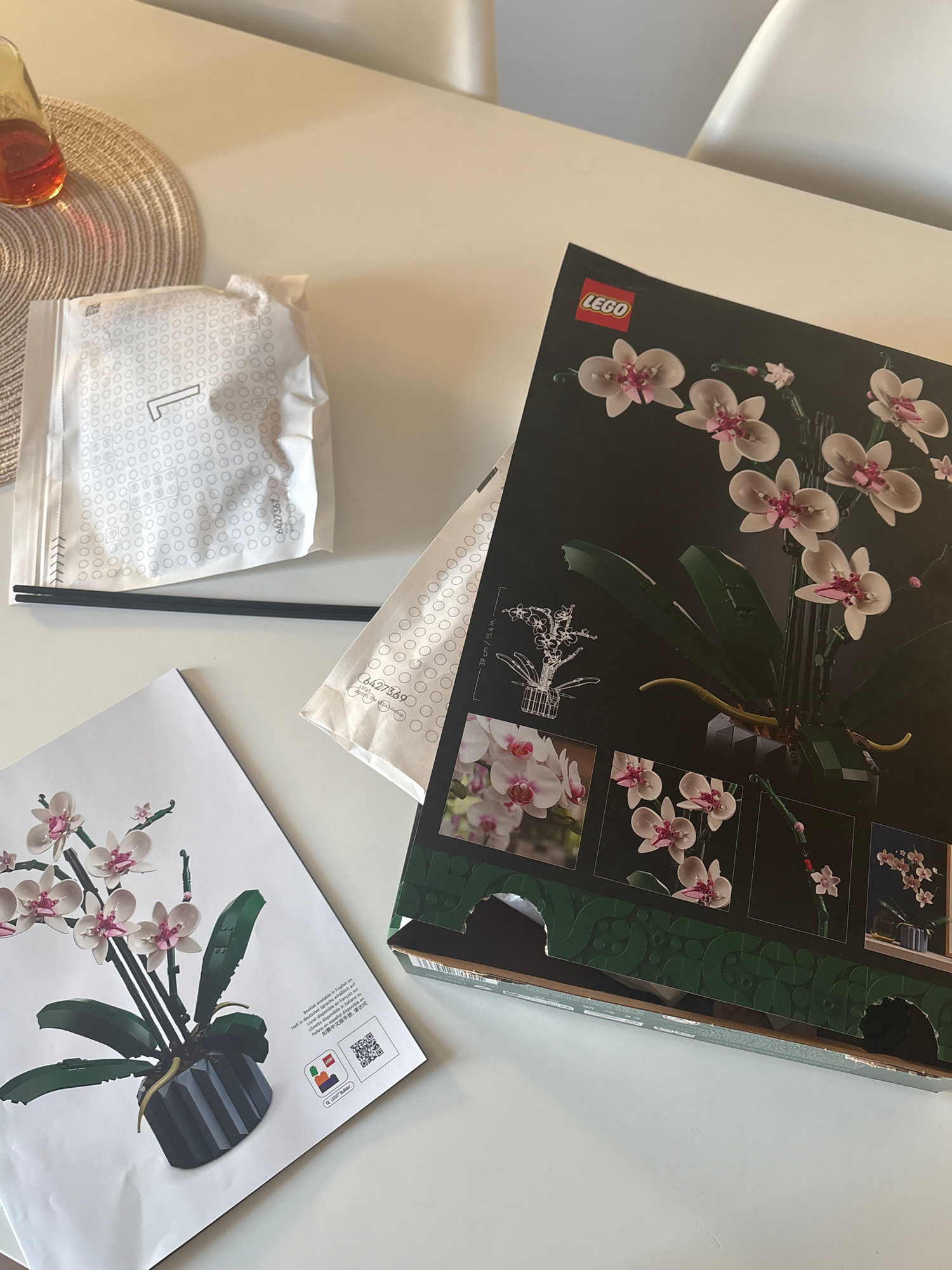 The image displays an overhead view of a white table, set up for assembling a LEGO Orchid botanical set. The primary subject is the open box of the LEGO Orchid set, featuring a large image of the intr…read more