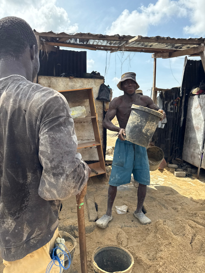 The scene, set in Ado, Nigeria, depicts an outdoor work environment under a partially cloudy sky. In the foreground, a dark-skinned male with his back to the camera wears a heavily stained dark gray l…read more