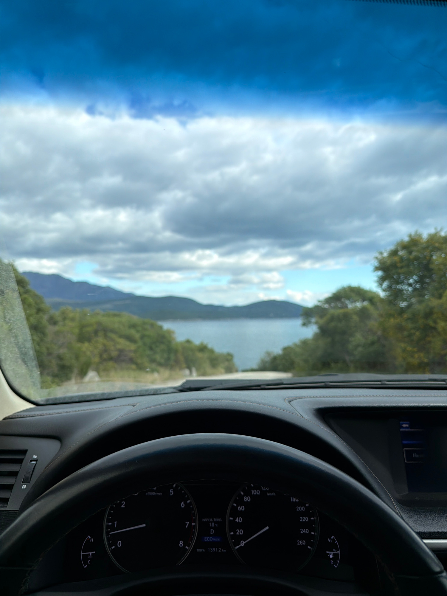A view from inside a car shows a winding road with mountains and a lake in the distance. The speedometer indicates the car is not moving. The digital display shows "TRIPA 1391.2km", suggesting the car…read more