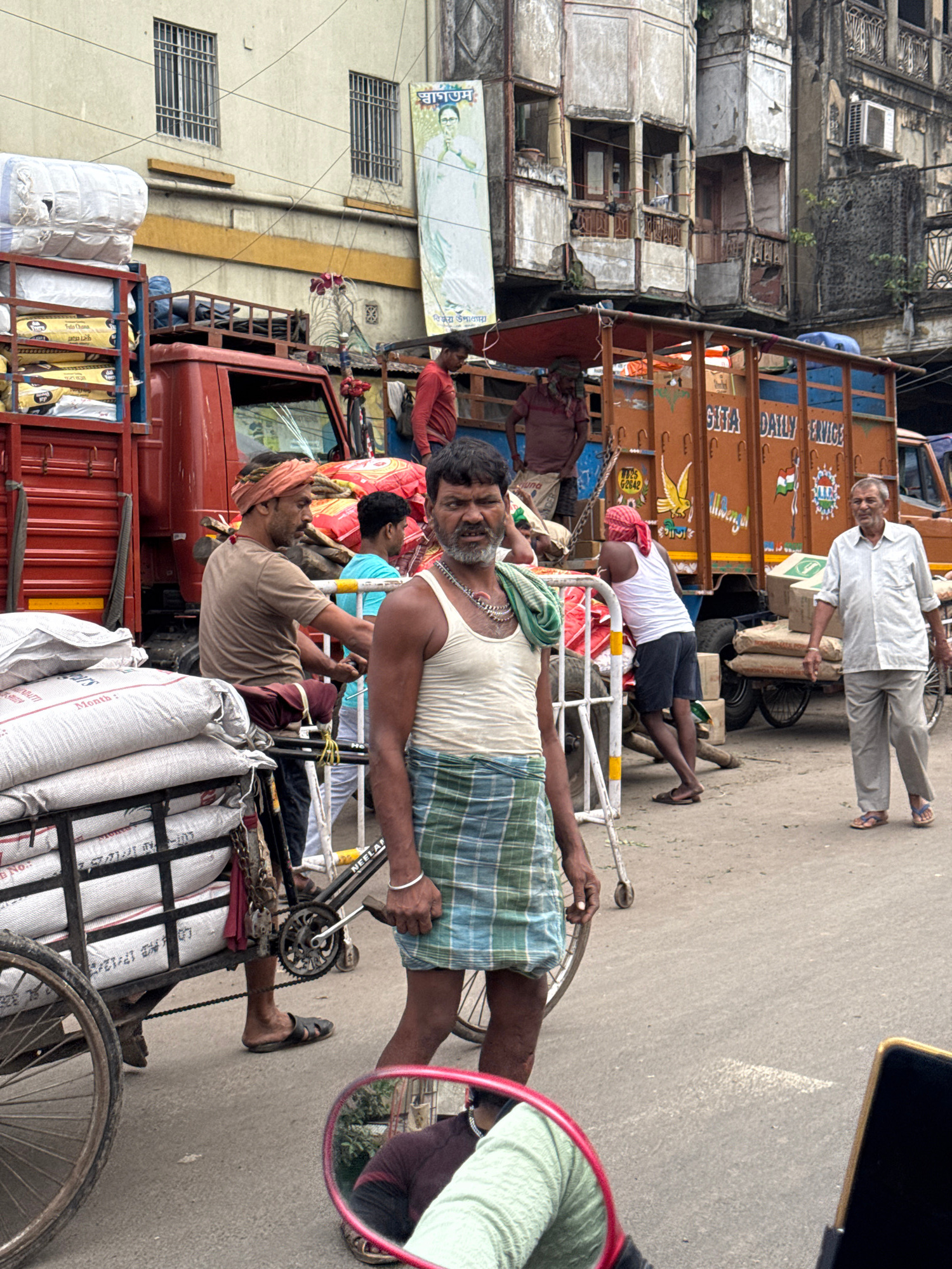 Here is a detailed description of the image: **Location:** The image appears to be taken on a street in Kolkata, India. The presence of trucks with Bengali writing and the type of rickshaws suggest t…read more