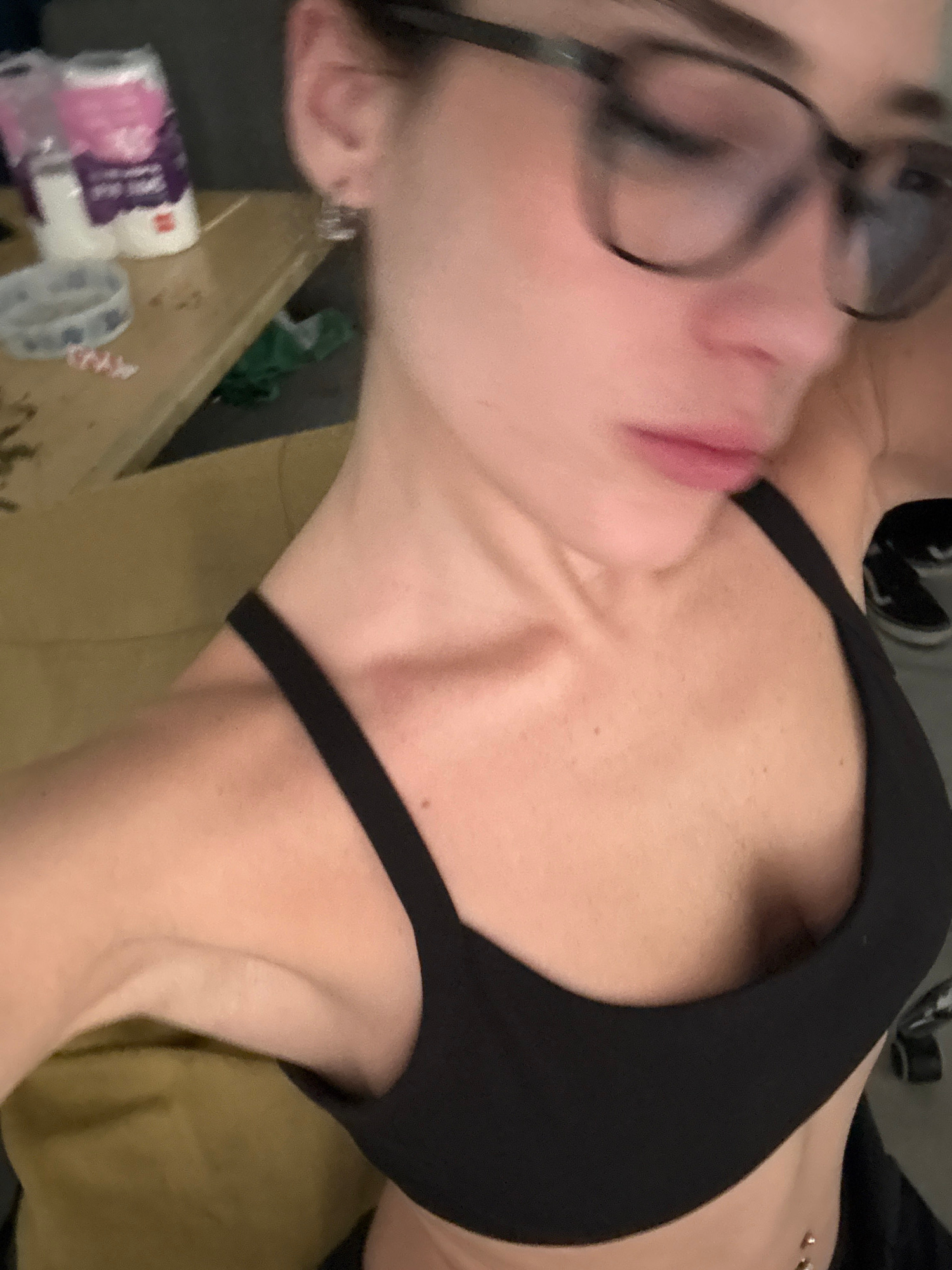 A woman wearing glasses and a black sports bra is lying down. The image is taken at an unusual angle. The location is unclear, but objects next to her could be on a nightstand, including some toiletri…read more