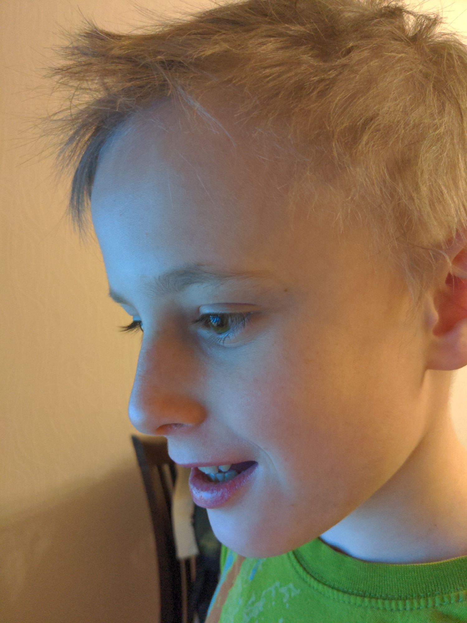 A close-up, slightly angled view of a child's face is presented, with the head tilted towards the right. The child has short, blonde hair and light skin. One eye is visible, along with the nose and pa…read more