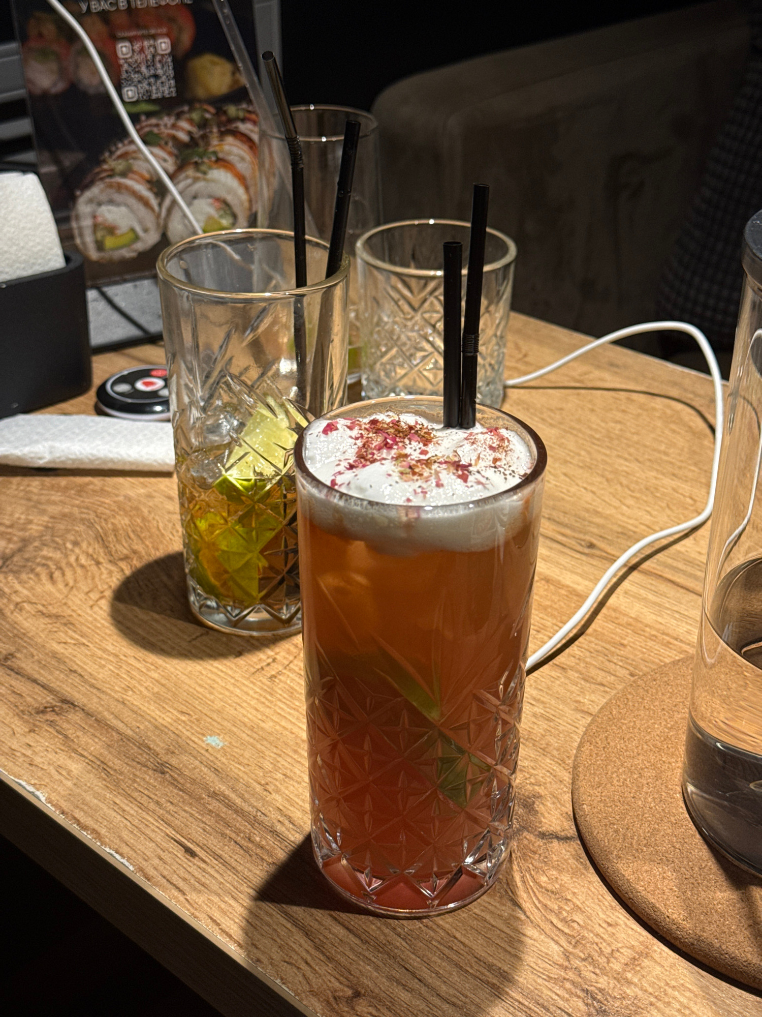 A still life photograph depicts three drinking glasses on a wood-grained surface. The glasses are of a cut-crystal design. One glass is filled with an amber-colored liquid, topped with a white foam de…read more