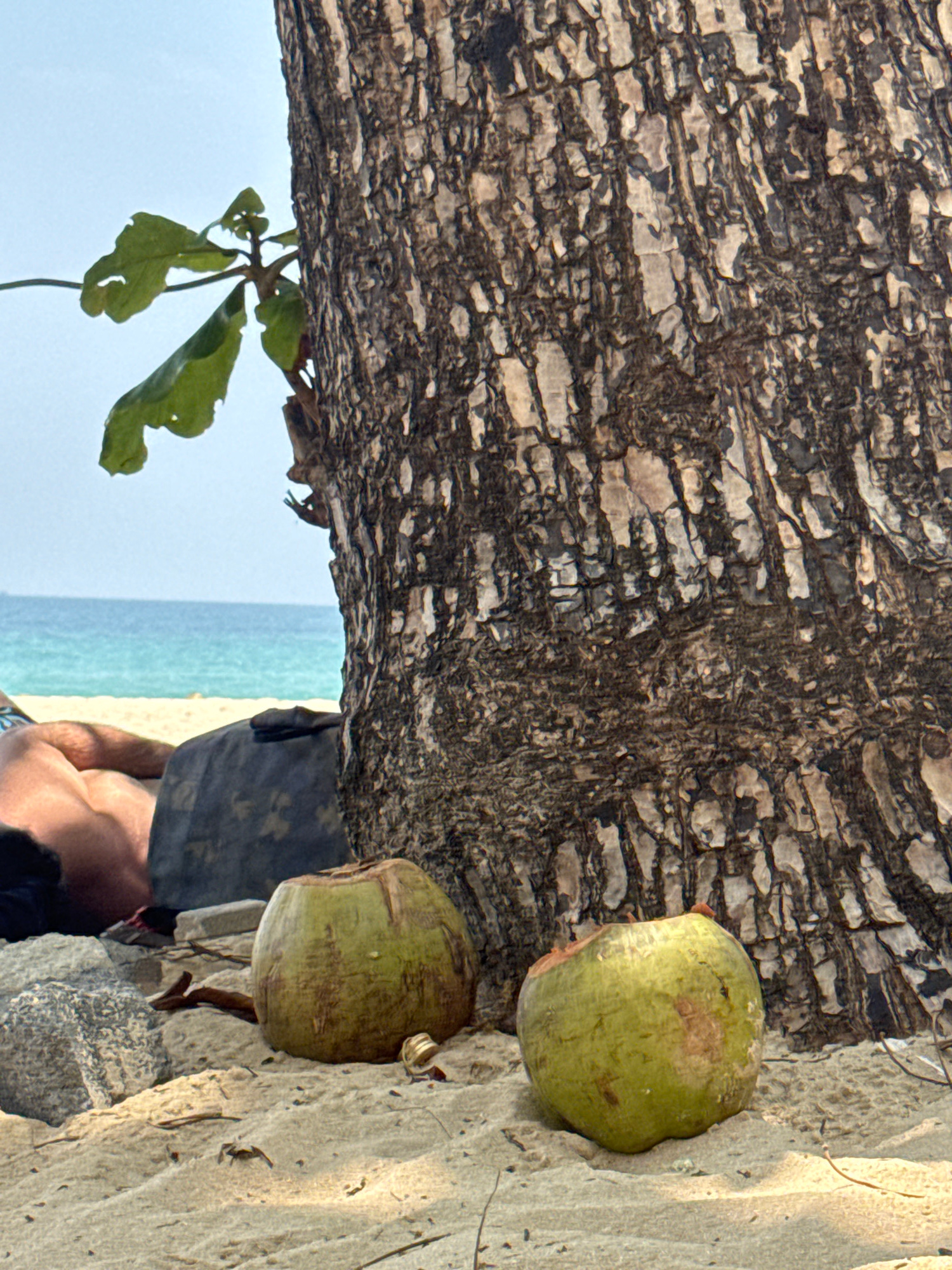 This image depicts a tranquil tropical beach scene in Choeng Thale, Thailand, likely in the late morning or early afternoon given the warm, bright sunlight. A large tree trunk, possibly a palm, with d…read more