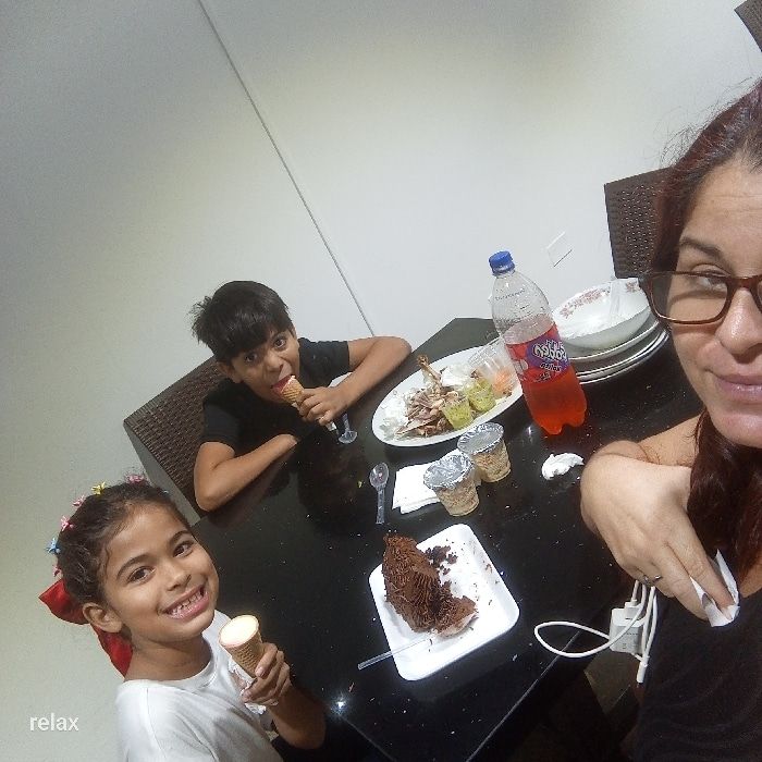 A group enjoys a meal together. A woman wearing glasses takes a selfie. A boy eats an ice cream cone with a playful expression. A girl smiles while holding a similar treat. The black table is covered…read more