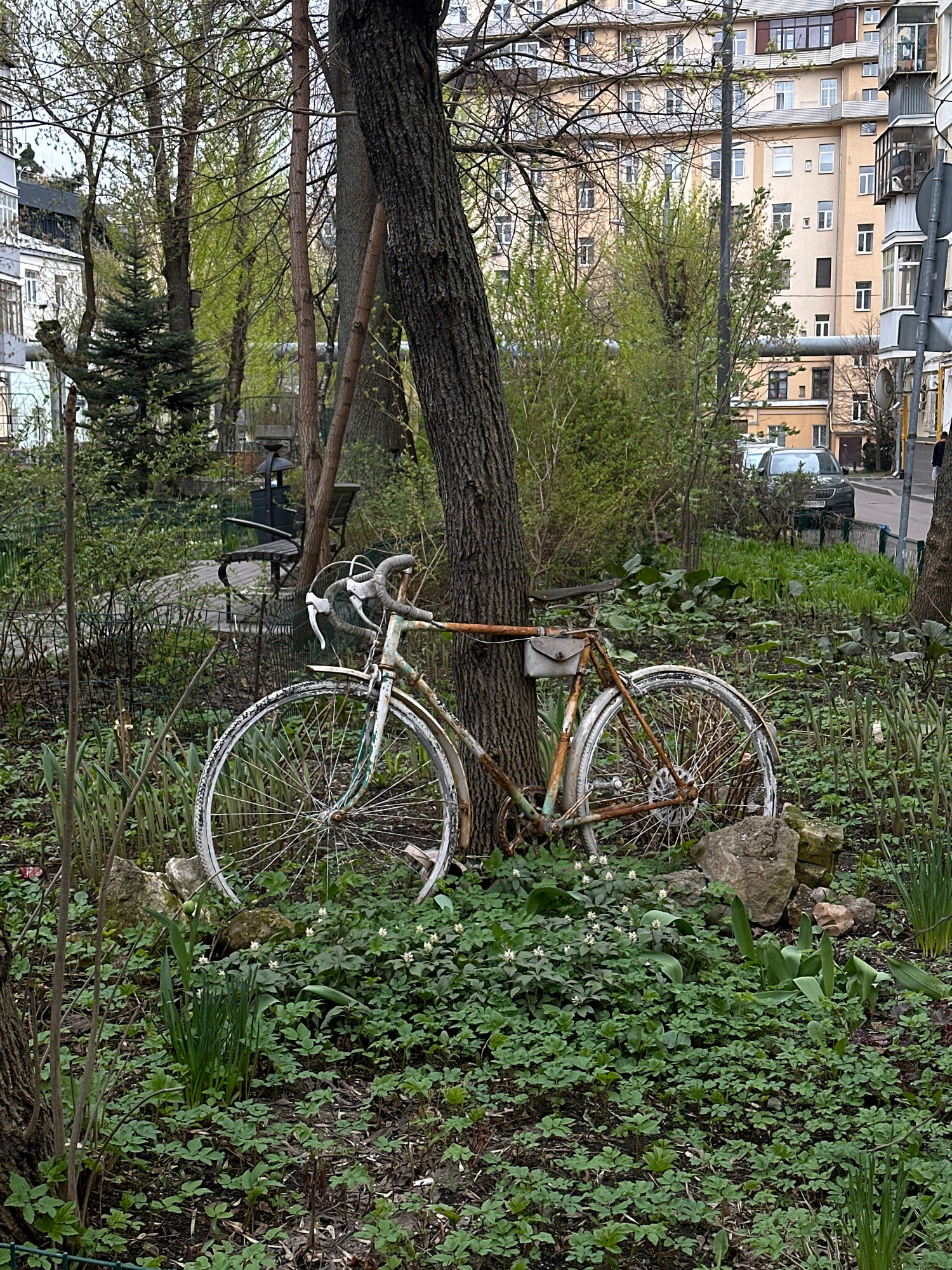 An old, rusted bicycle is leaning against a tree trunk in a grassy area. The bike is white with rusted metal components. The surrounding vegetation includes clover, small plants, and green foliage. Be…read more