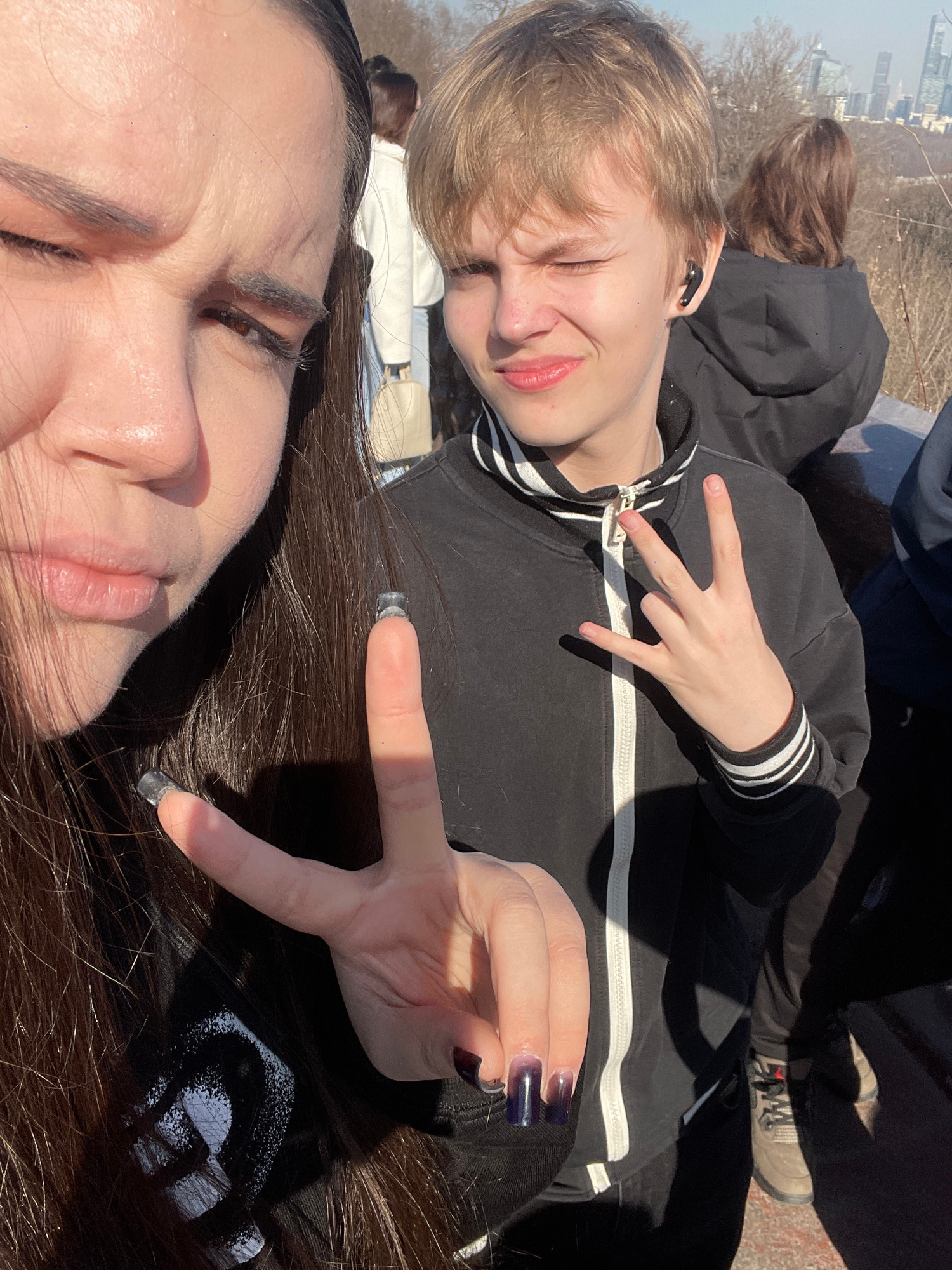 Two people are visible. One person with short blonde hair is wearing a black jacket with white stripes on the sleeves and black earbud. The other person is lying next to them with long brown hair and…read more