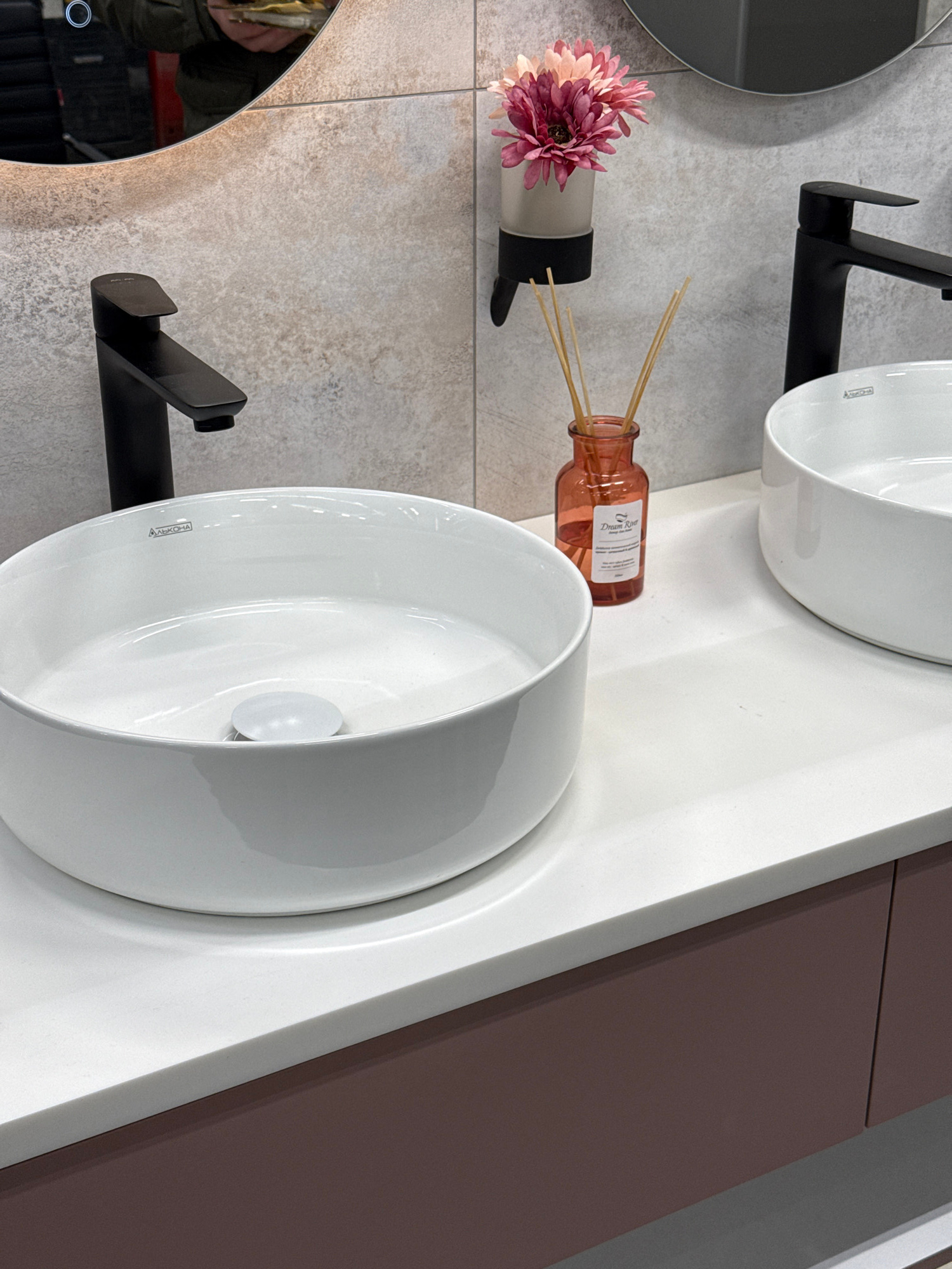 The image shows a bathroom interior. Two white, round vessel sinks are mounted on a white countertop. Each sink has a black, modern faucet. A small glass bottle containing liquid and reed diffusers si…read more