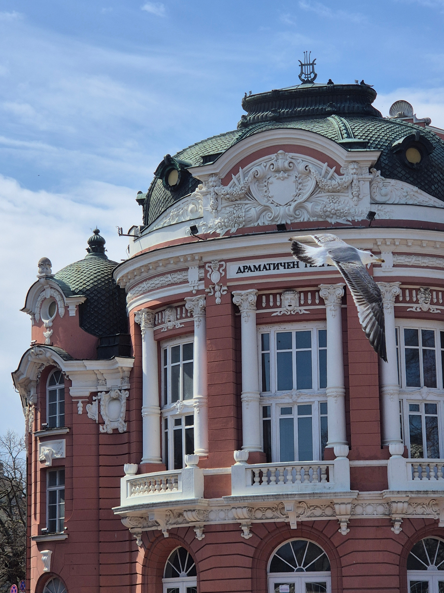 The image depicts a low-angle, upward-facing view of the Drama Theater in Varna, Bulgaria, partially obscured by a seagull in mid-flight. The theater's architecture is characterized by a salmon-coloreβ¦read more