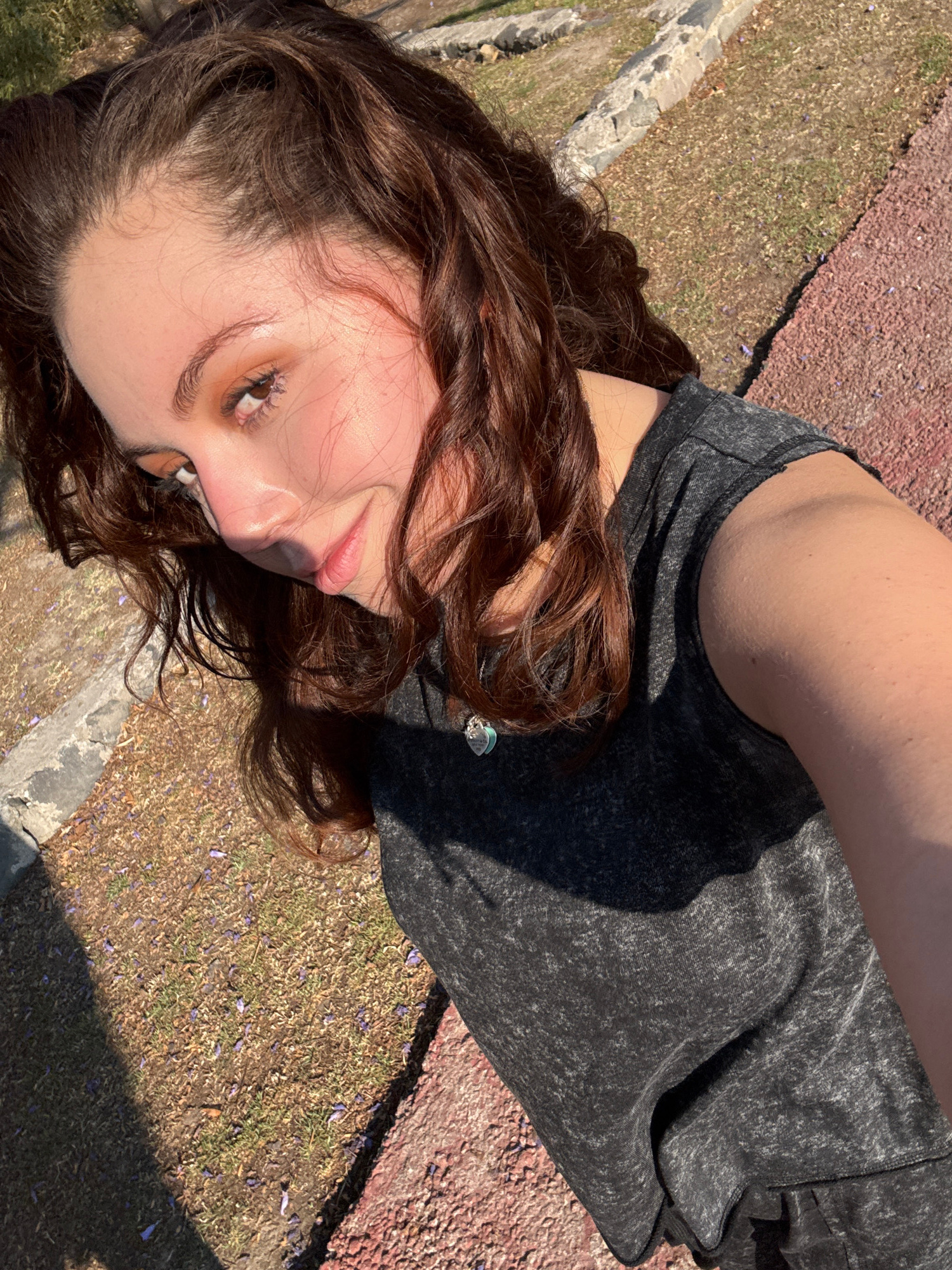 A young woman is lying on her back in an outdoor setting in Santa Clara Ocoyucan, Mexico. Her head rests near a weathered stone structure, while the rest of her body lies on a surface partially compos…read more