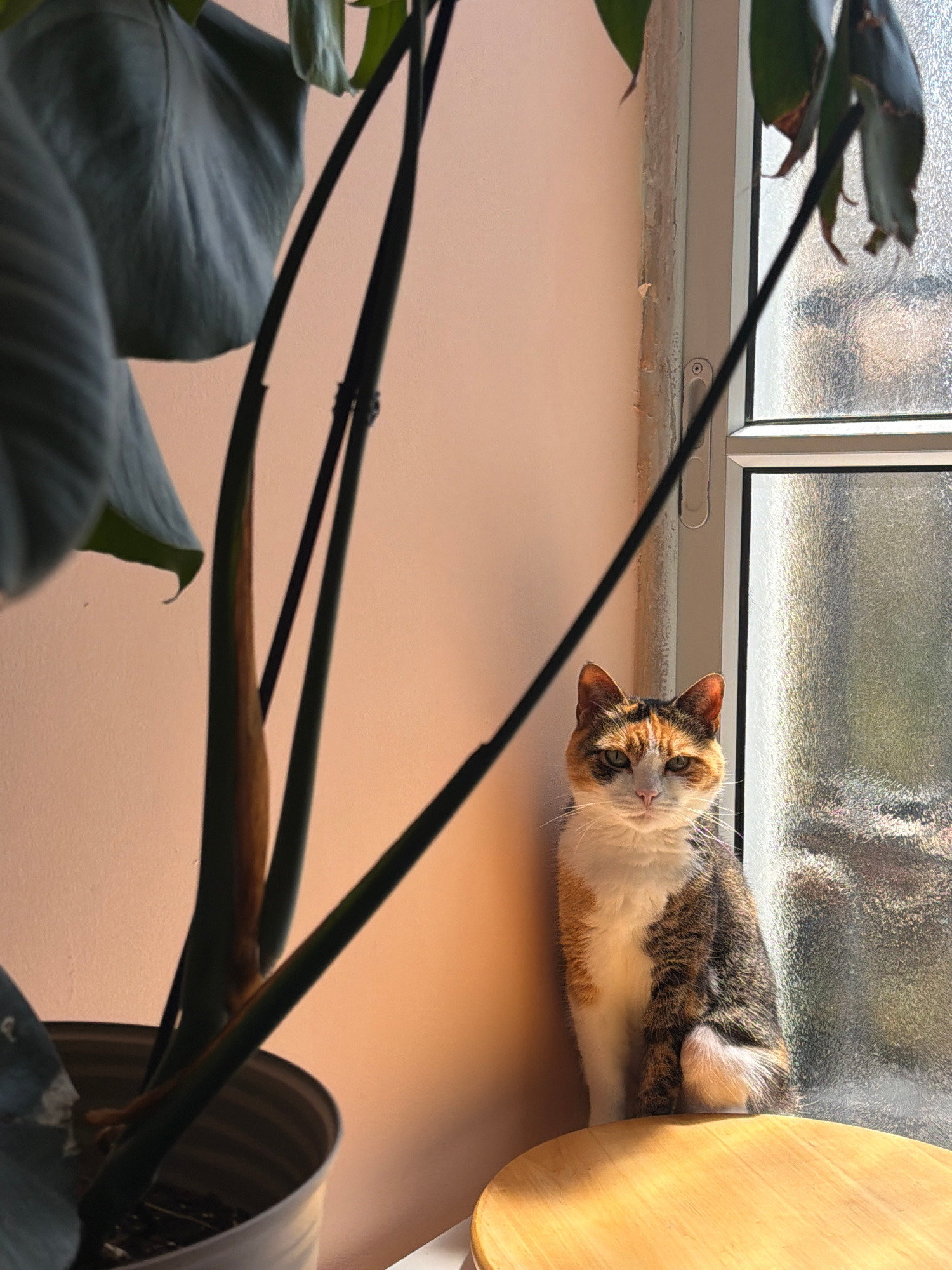A calico cat lies on a windowsill next to a wooden chair. A potted plant with large leaves and long stems is in the foreground. The window looks out onto a blurred scene of foliage and buildings. The…read more