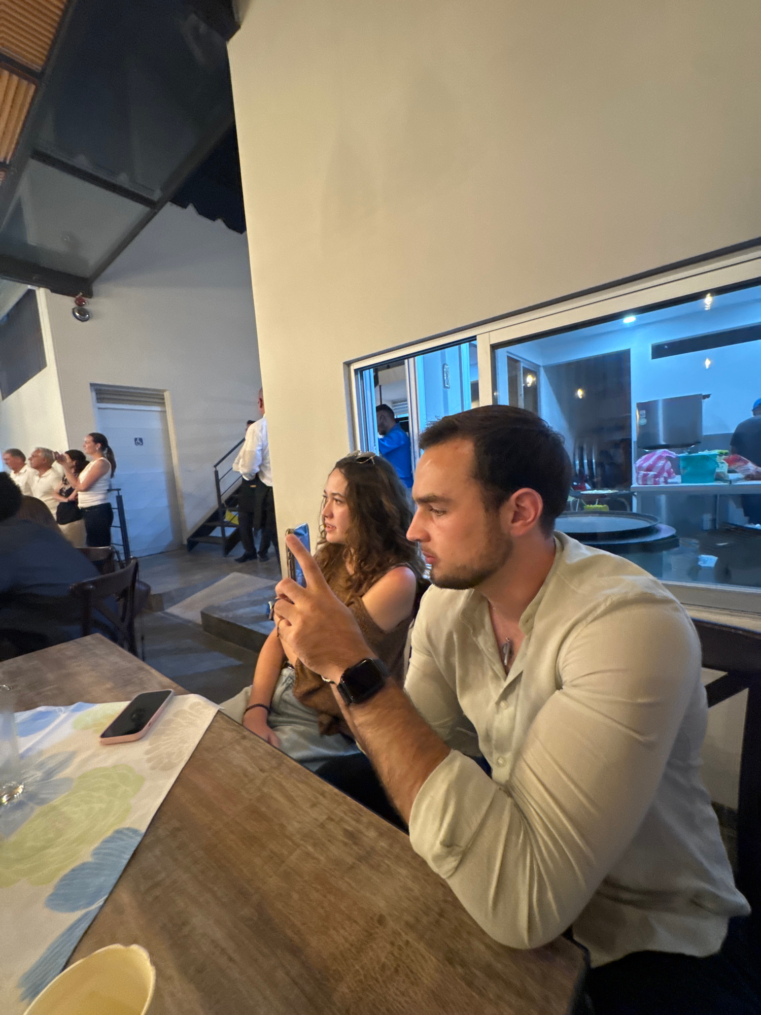 The scene appears to be indoors, possibly a restaurant or dining area in San Bernardino Tlaxcalancingo, Mexico. A man in a light-colored, button-down shirt is looking at a smartphone held by a woman w…read more