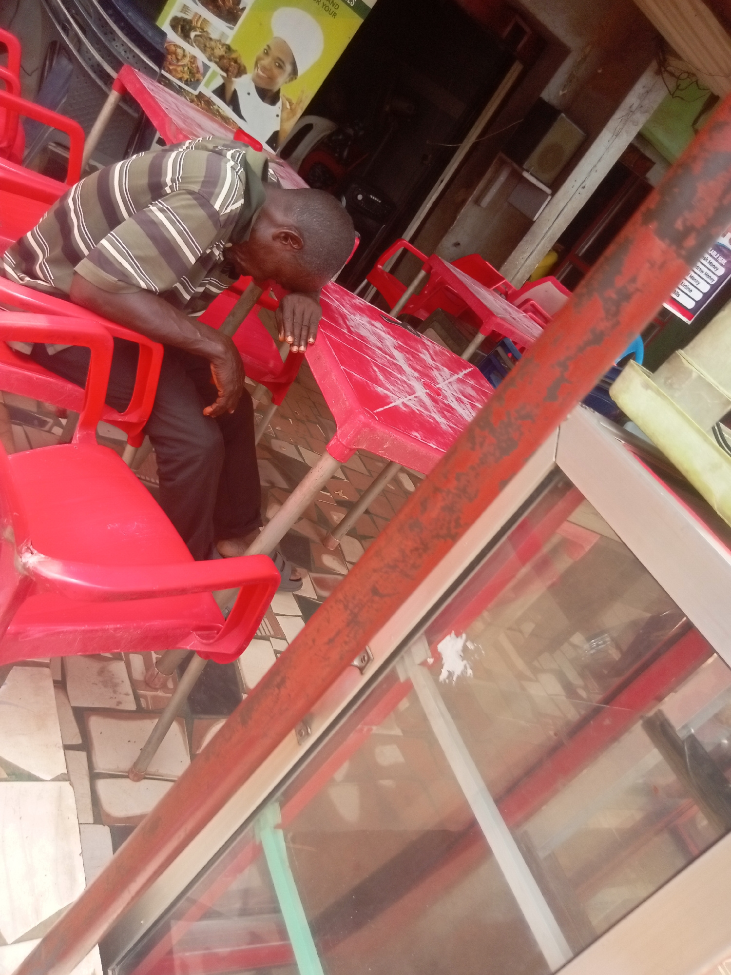 A man rests on a red plastic chair, his head on a red plastic table in Nkpor, Nigeria. He wears a striped shirt and black pants. The area appears to be an outdoor dining or seating area of a restauran…read more