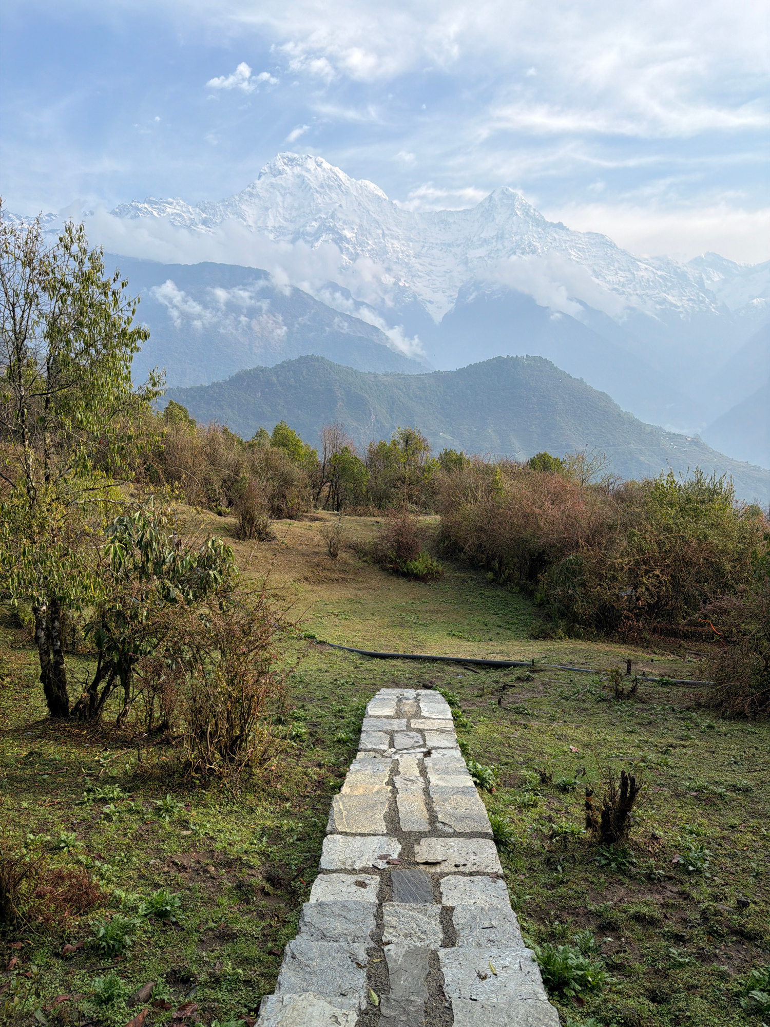 The image depicts a panoramic mountain landscape in Purano Ghandruk, Nepal, under a partly cloudy sky. A narrow stone path, constructed from irregular light grey flagstones, extends from the bottom ce…read more