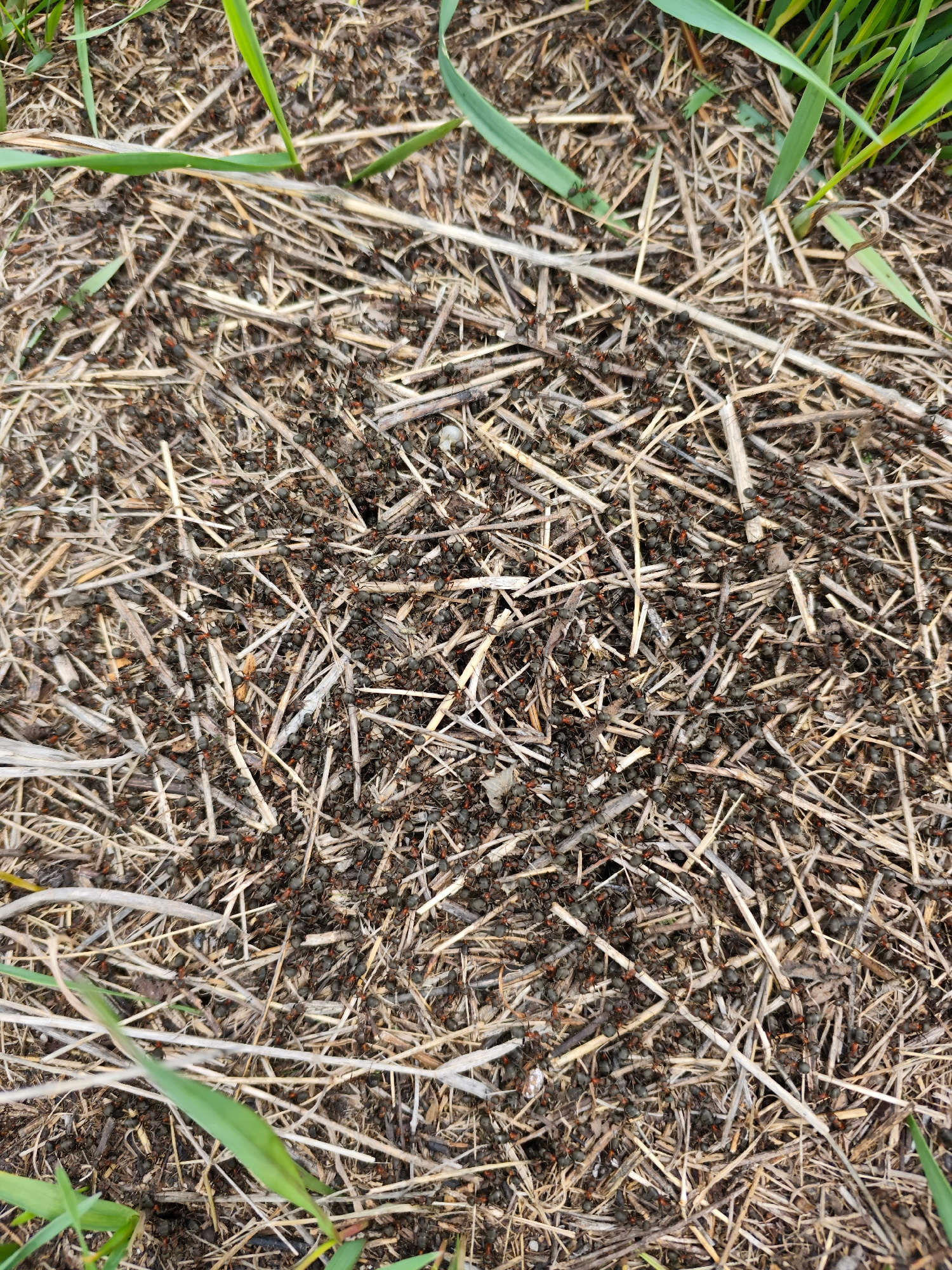 The image depicts an ant nest or colony on the ground in a location believed to be near Etoka, Russia. The nest is constructed with small pieces of dried straw and other organic matter. Numerous ants…read more