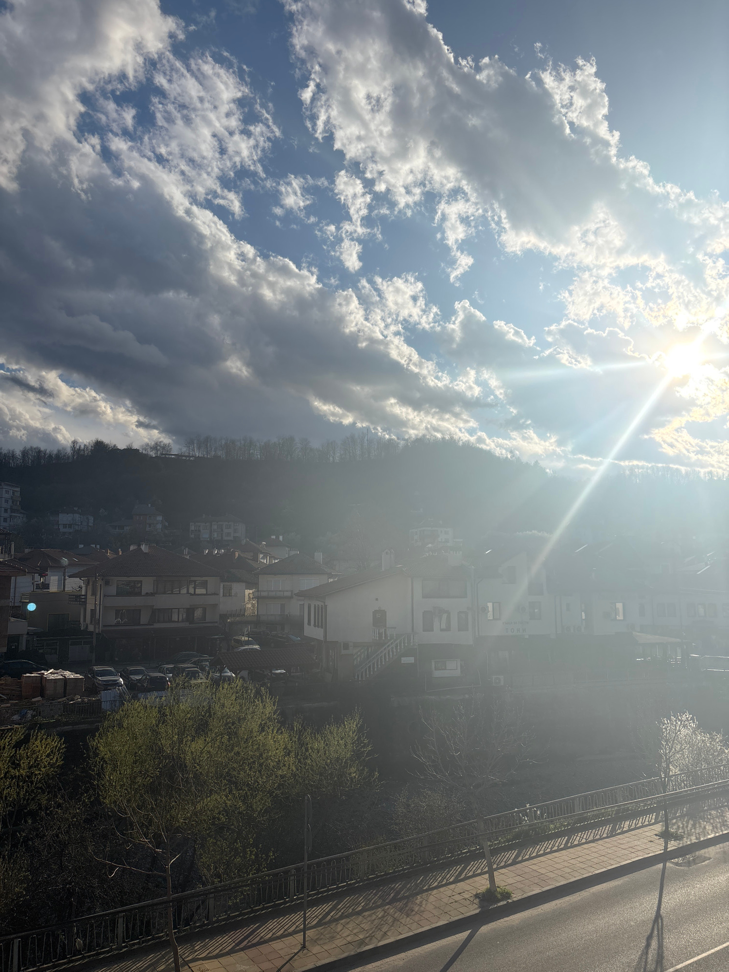 The image depicts a cityscape in Zlatograd, Bulgaria, under a bright, sunlit sky with scattered clouds. The sun is positioned high in the sky, casting strong rays. The foreground shows buildings, roadβ¦read more