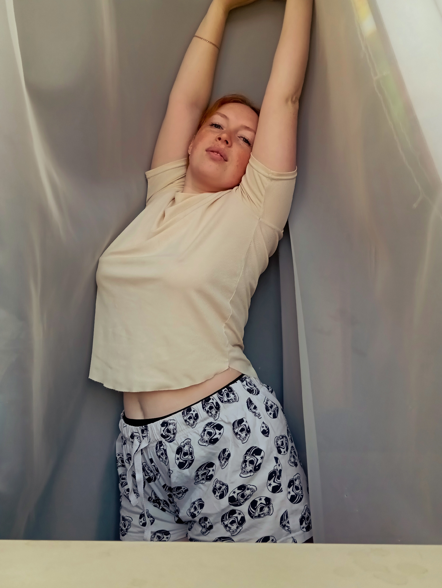 A young woman with reddish hair is lying down, apparently indoors. She is wearing a light tan t-shirt and patterned white and black shorts. Her arms are raised above her head, holding up a piece of li…read more