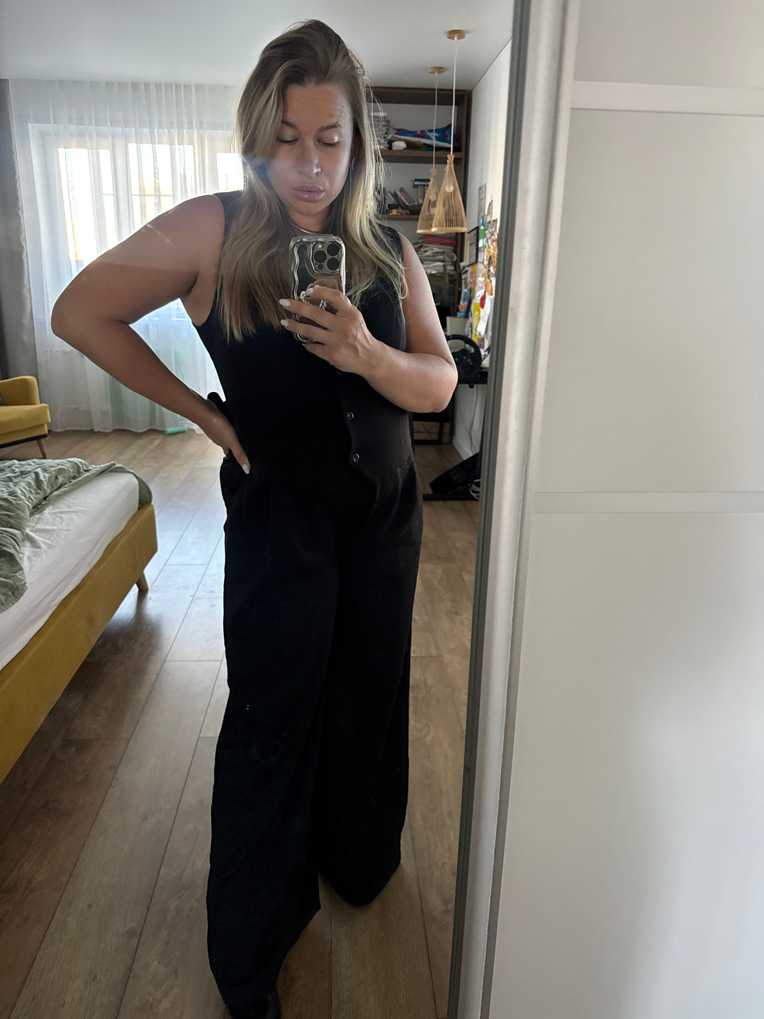 A woman is taking a selfie in a mirror. She is wearing a black jumpsuit. The room is a bedroom with light-colored wooden floors and a bed with a yellow frame and a green and white patterned comforter.…read more