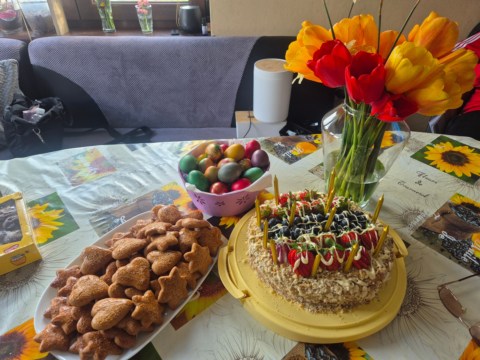 The image shows a table laden with food, likely for a celebration. On the left is a box of cookies and a plate of gingerbread cookies in star and heart shapes. In the center is a bowl of colored Easteβ¦read more