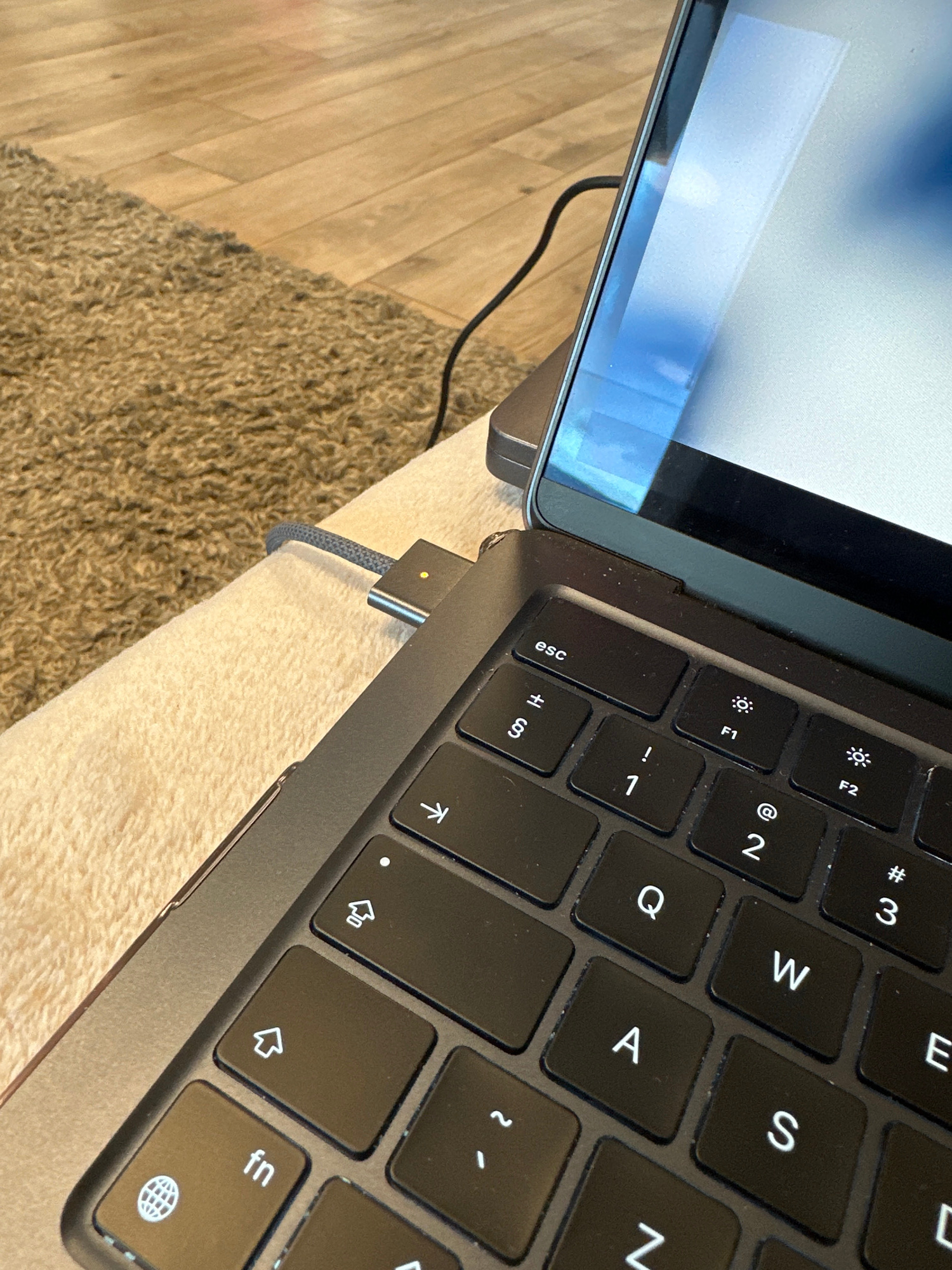 A close-up photograph depicts a portion of a dark gray laptop keyboard with keys labeled "esc," "F1," "F2," "1," "2," "3," "Q," "W," "E," "A," "S," "Z," "fn," and other symbols, next to a laptop scree…read more