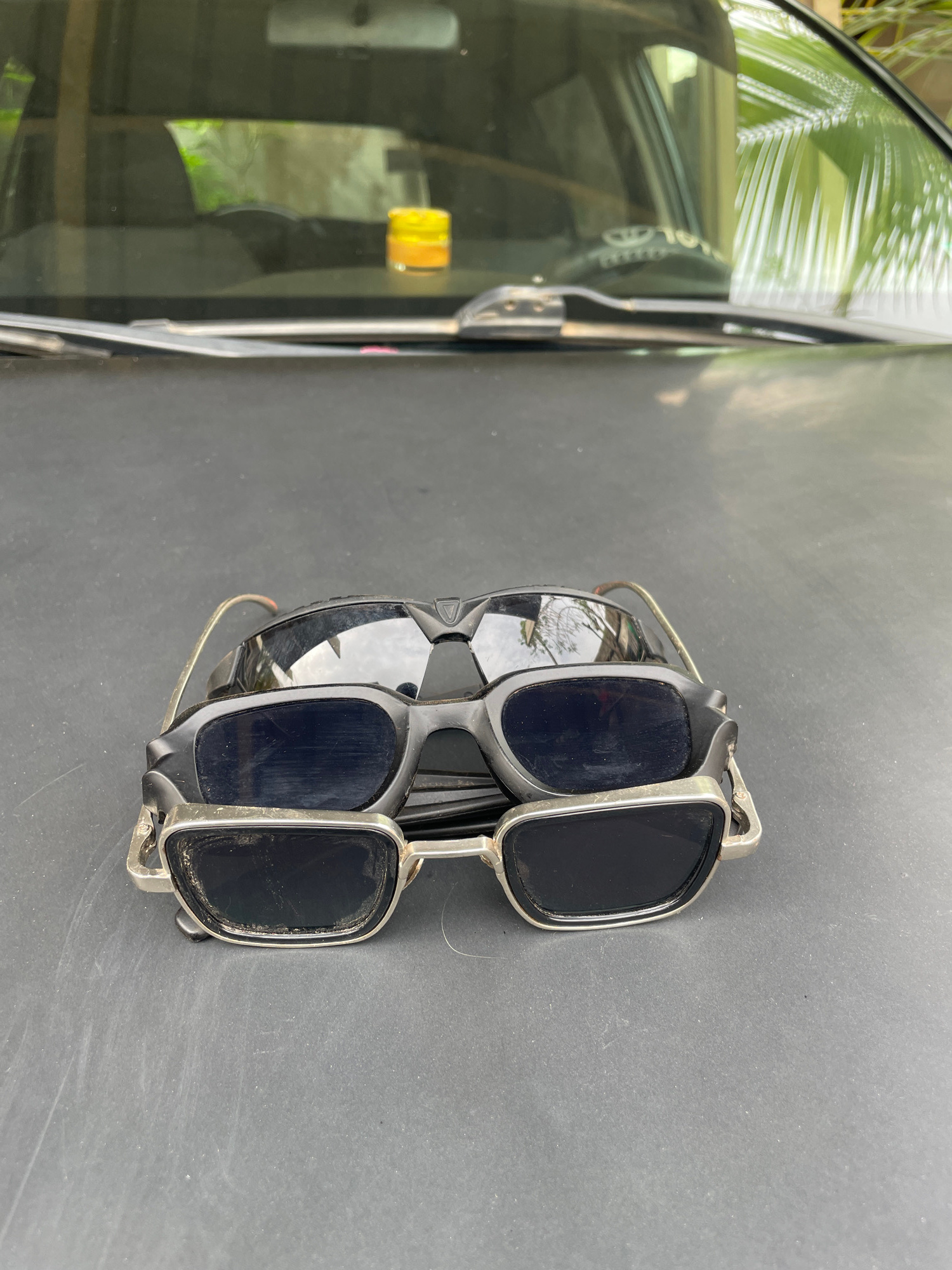 Two pairs of sunglasses are stacked on a dark, possibly black, surface. The pair on top has rectangular lenses and a silver frame. The pair underneath has rounded lenses and a dark frame. The sunglass…read more