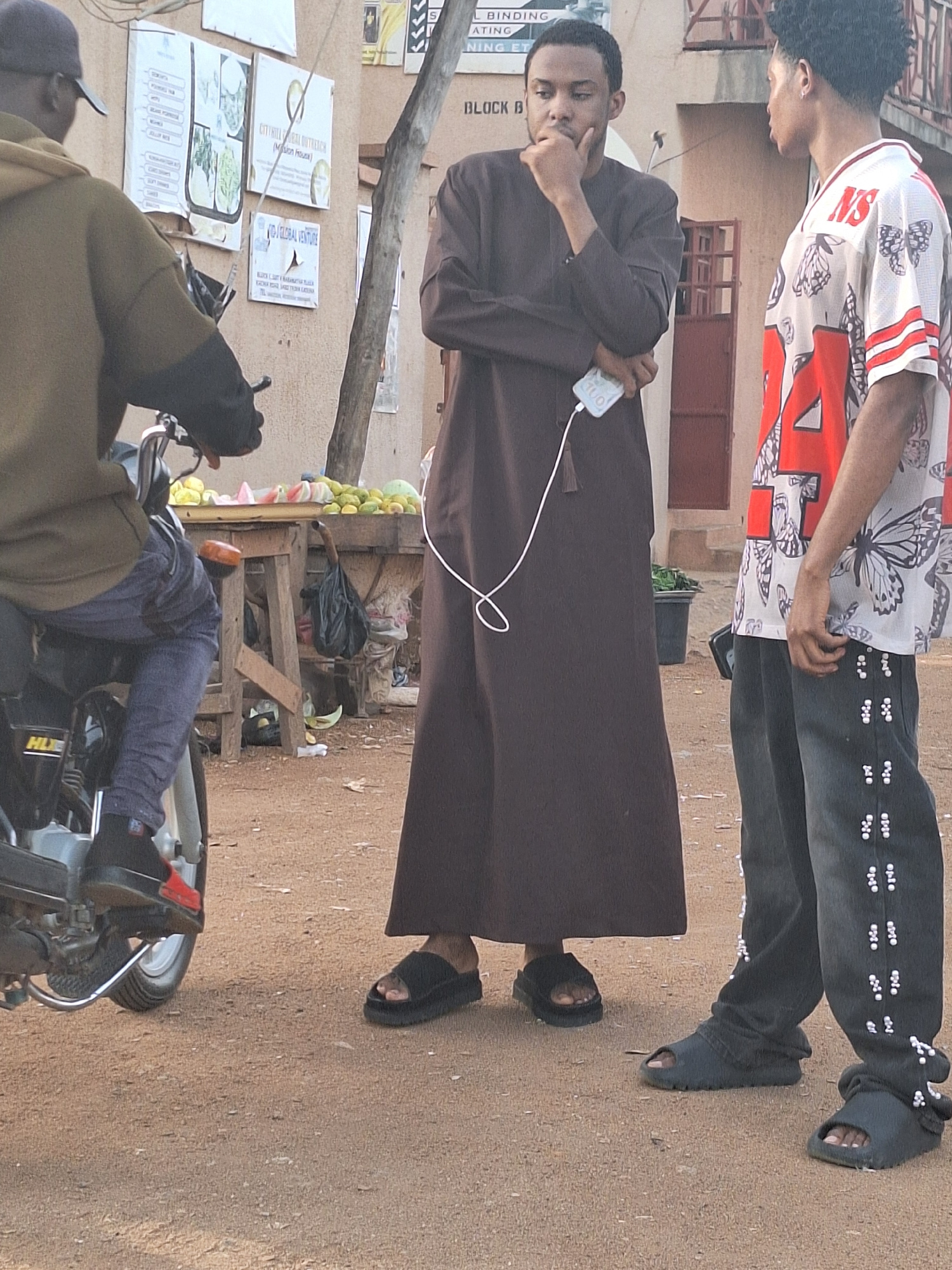 Here is a description of the image: Location: Sabon Tasha, Nigeria. A medium shot captures an outdoor scene with several individuals and objects. Two men are standing, the first clad in a white shir…read more
