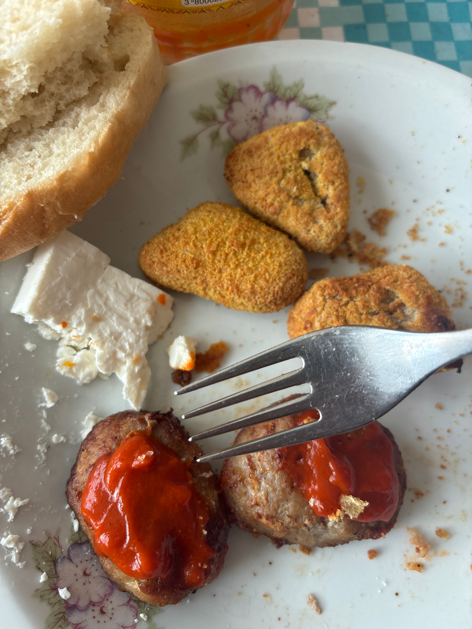 A cluttered plate on a table in an unspecified location, likely Zlatograd, Bulgaria, contains remnants of a meal. The plate is white with floral decorations. The meal appears to include: * Several b…read more