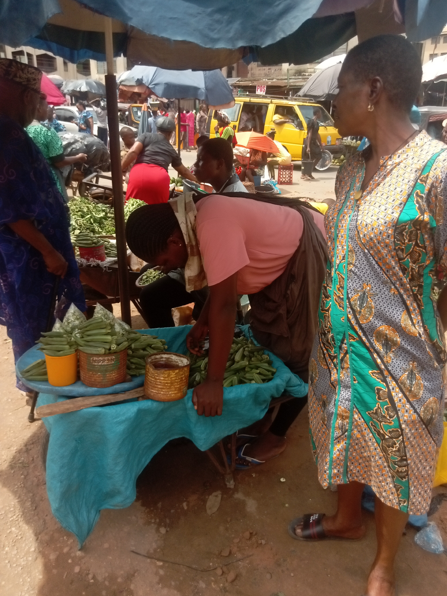 On a street in Onitsha, Nigeria, a marketplace scene unfolds under the shade of umbrellas. A woman in a patterned green and gray dress stands observing. Another woman in a pink shirt sorts okra on a t…read more