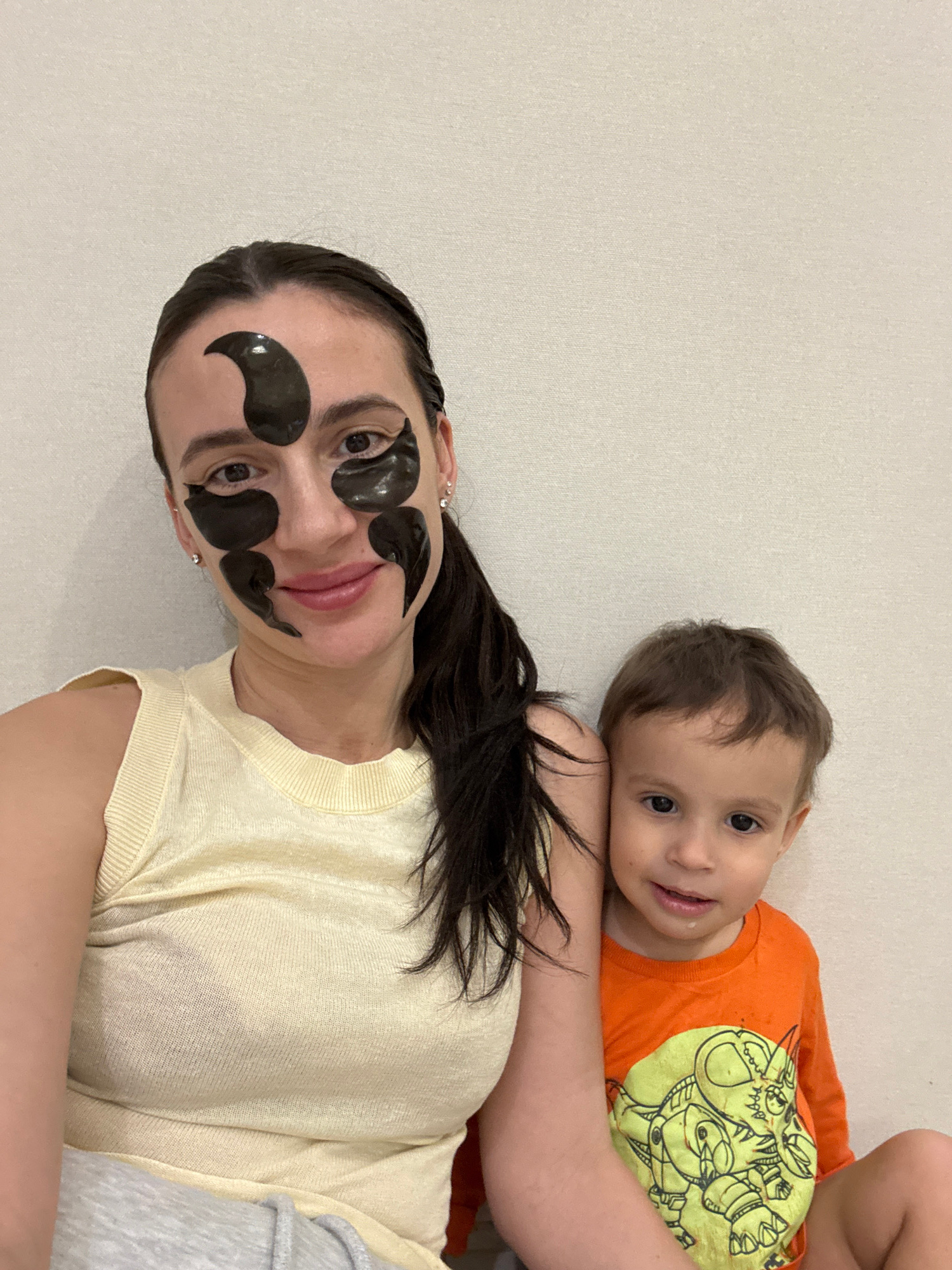 A woman and a child are lying next to each other on a light-colored surface. The woman has dark hair pulled back in a ponytail, and she is wearing black eye patches. She is wearing a light yellow t-sh…read more