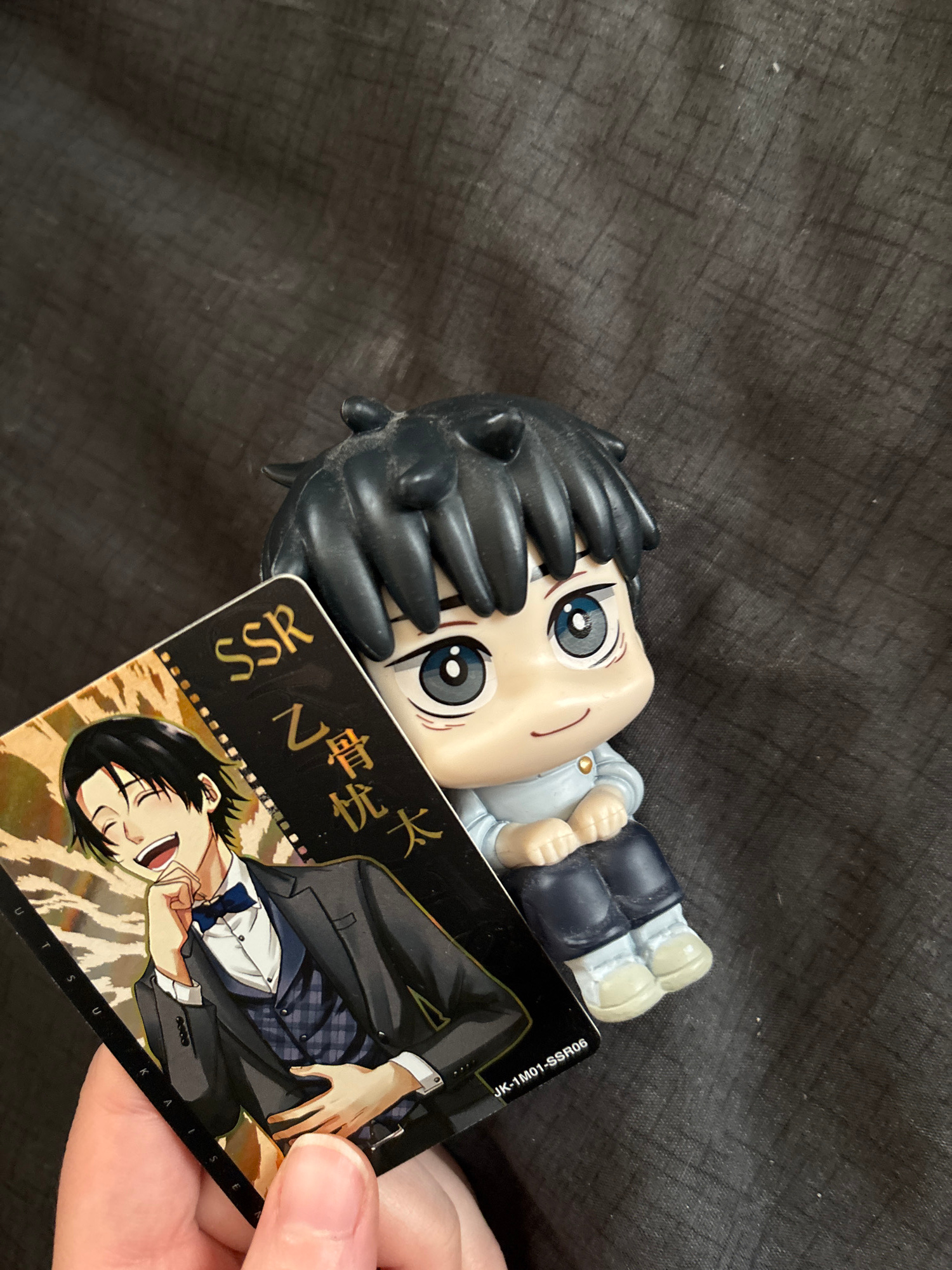 The image displays a close-up of anime merchandise arranged on a dark, textured fabric surface. A small, stylized figurine with black, spiky hair, pale skin, and prominent blue eyes is lying on its ba…read more