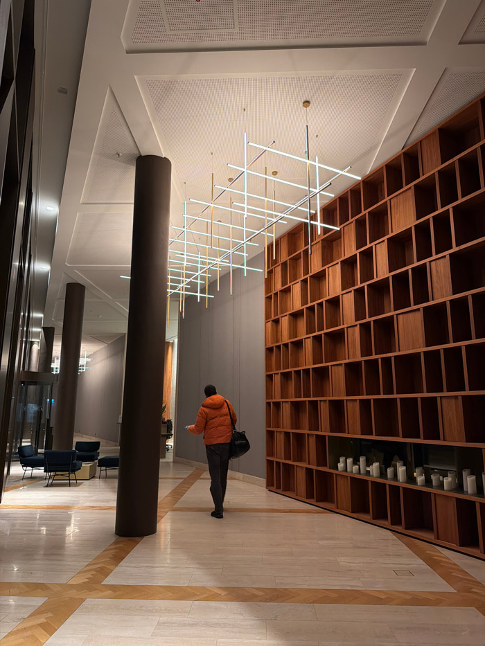 An interior shot, appearing as if the camera is looking up. A person in an orange jacket is walking on the marble floor. The ceiling features a large, brown, square grid pattern and modern linear lighβ¦read more