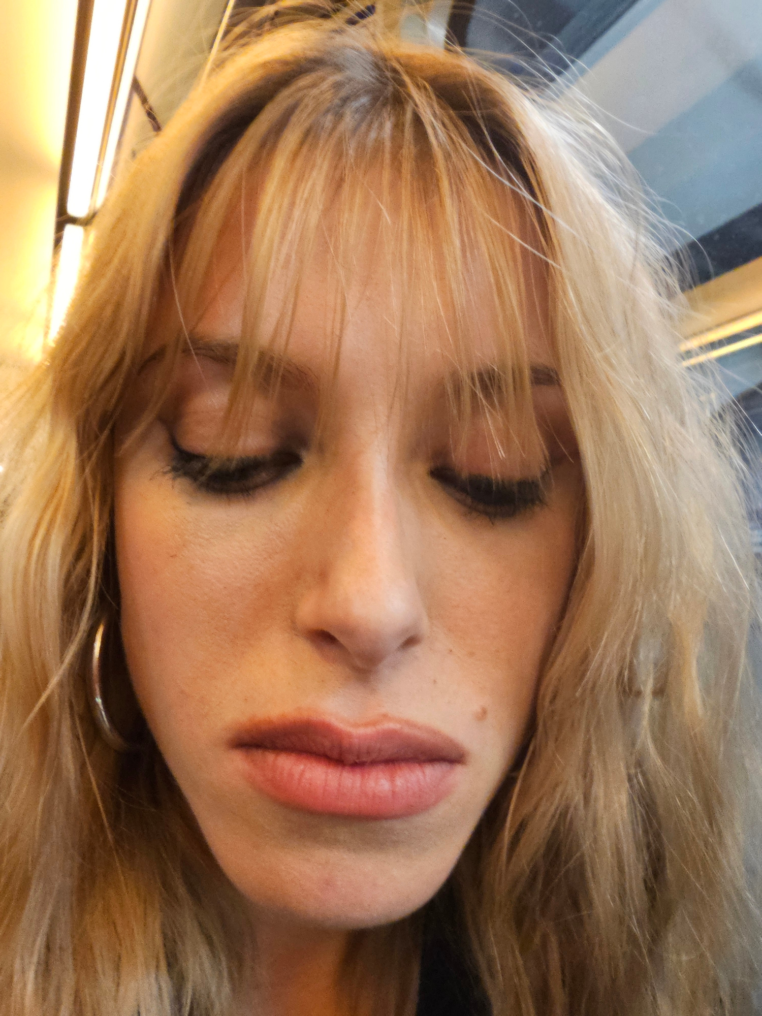A close-up, high-angle shot captures a woman with blonde hair and closed eyes, seemingly asleep. Her face is tilted slightly to the side. She is wearing a gold hoop earring. The background is out of fâŚread more