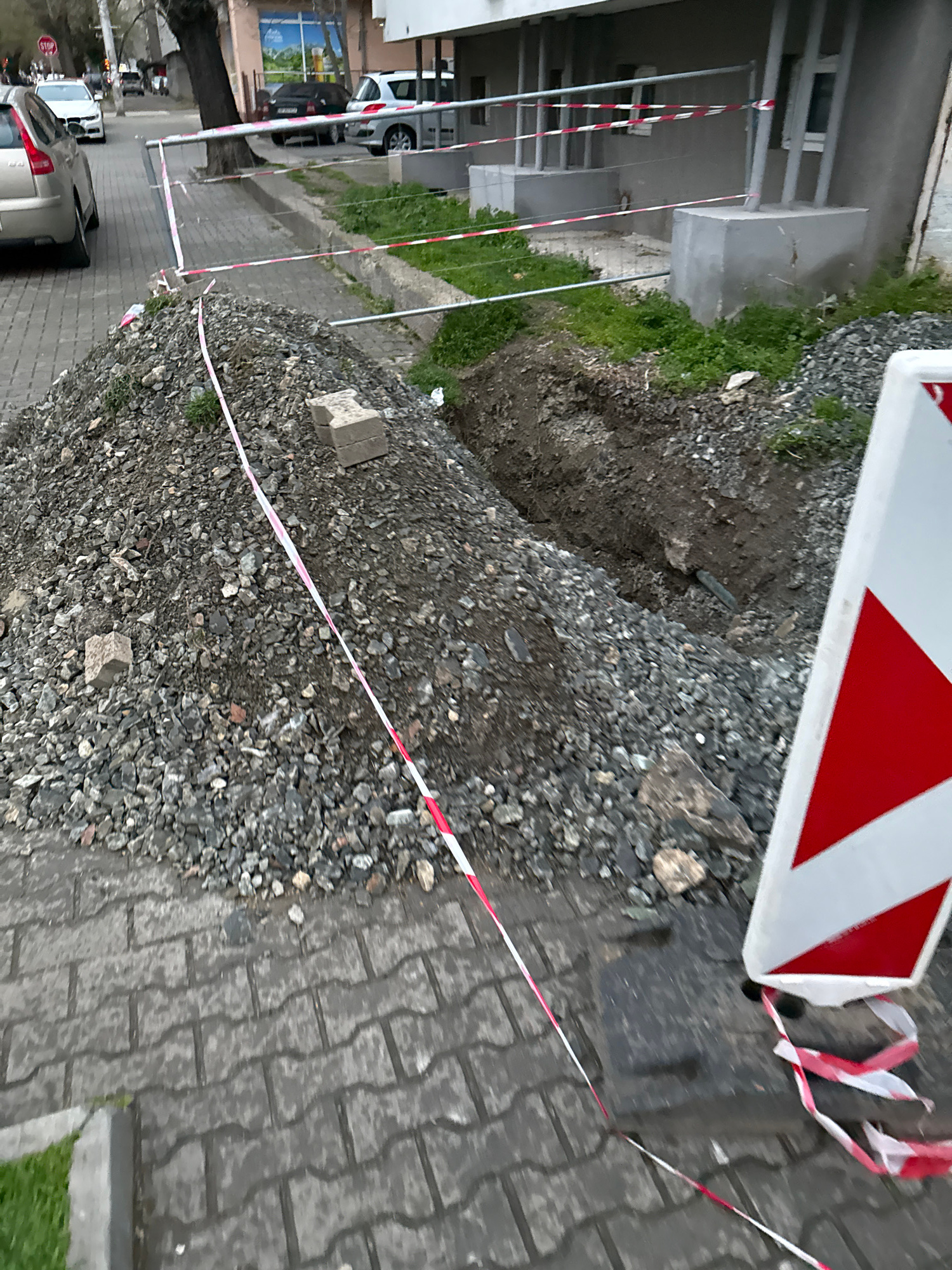 The image depicts a construction site on a paved street in Stara Zagora, Bulgaria. A pile of gravel and dirt is visible, cordoned off by red and white striped caution tape. A red and white striped roaβ¦read more
