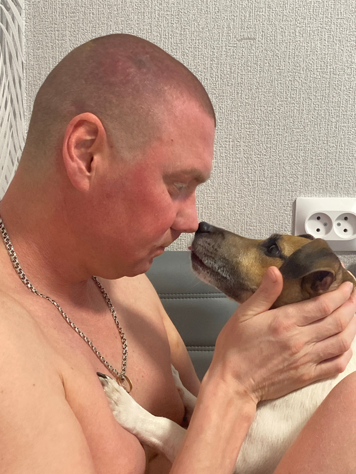 A man is lying down with a dog on his chest. The man is bald, has fair skin, and is wearing a silver chain necklace. He is looking up at the dog with his eyes closed, and the dog's nose is touching th…read more