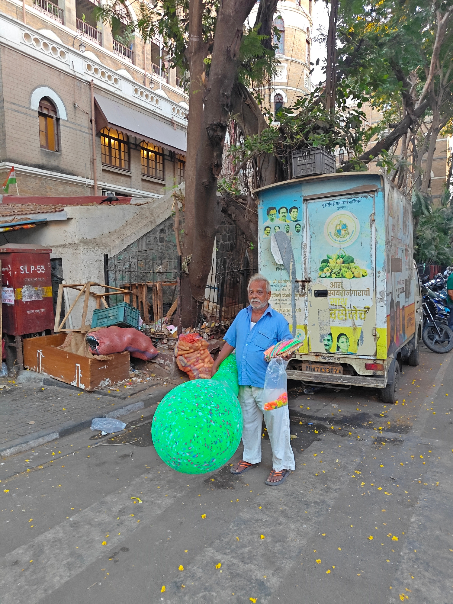 The image depicts an elderly man standing on a street in Mumbai, India. He is holding a large green balloon and a bag of smaller, colorful objects, possibly toys or trinkets. Behind him is a small, fa…read more