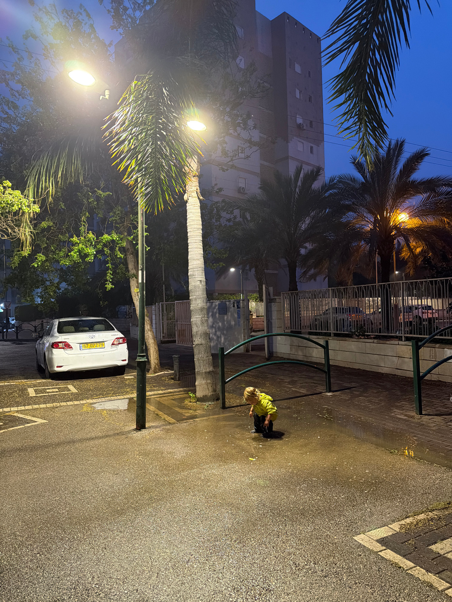 The image shows a street scene at night in Kiryat Bialik, Occupied Palestine. A young person wearing a bright yellow shirt is crouching near a green metal structure. The street surface appears wet. A…read more