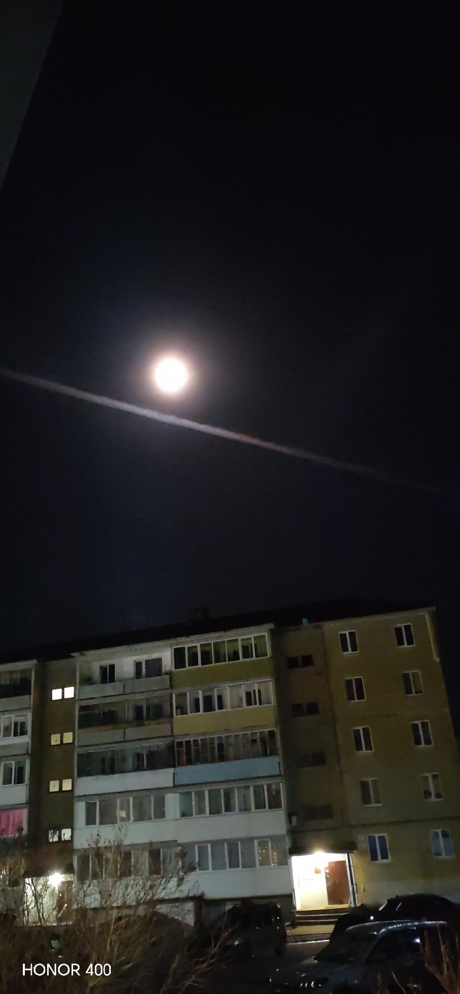 The image shows a multi-story residential building in Noviy Urengoy, Russia, at night. The sky is dark with a bright moon and a contrail across it. The building has multiple floors with illuminated windows. There are trees in the foreground and parked cars. The image was taken with an HONOR 400 mobile phone. | Open Wire