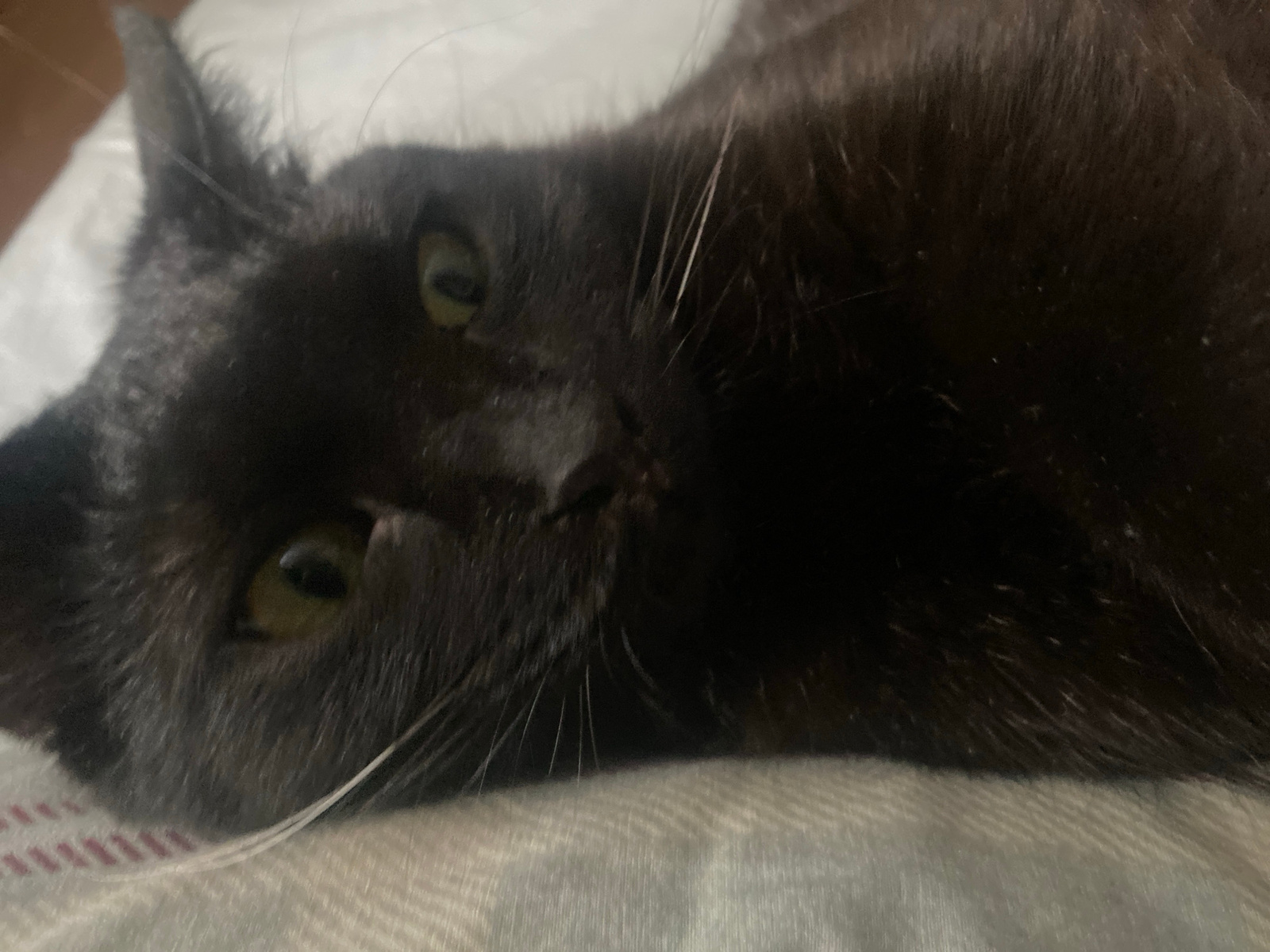 A black cat is lying down on a gray surface. The cat's head is slightly tilted to the side, and its eyes are open. The environment is indoors. The location is not identifiable.