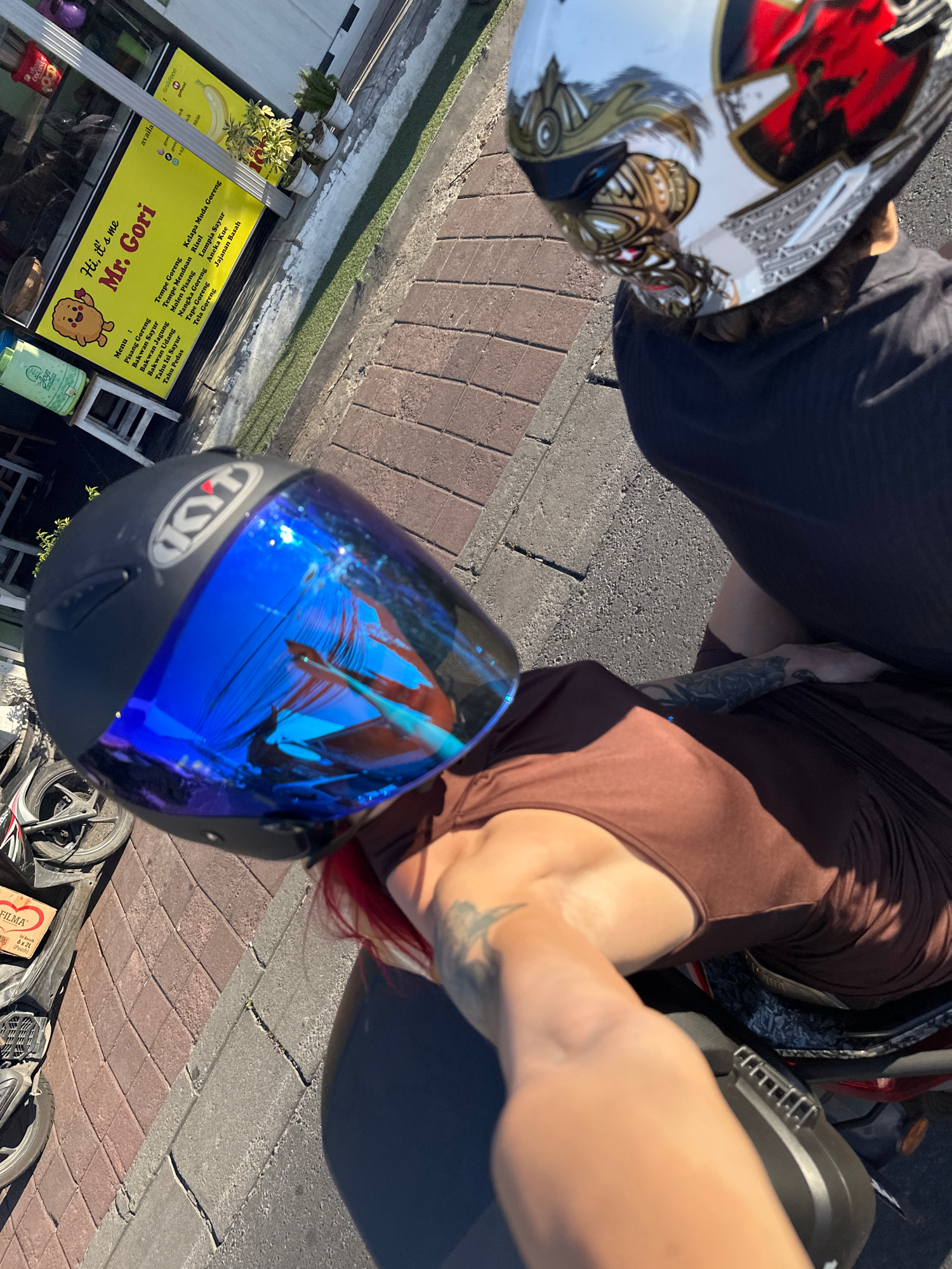 The scene depicts two individuals on a parked motorcycle, located in North Kuta, Indonesia. The first person, partially visible, wears a brown top, has a tattoo on their arm, and red hair. They wear a…read more