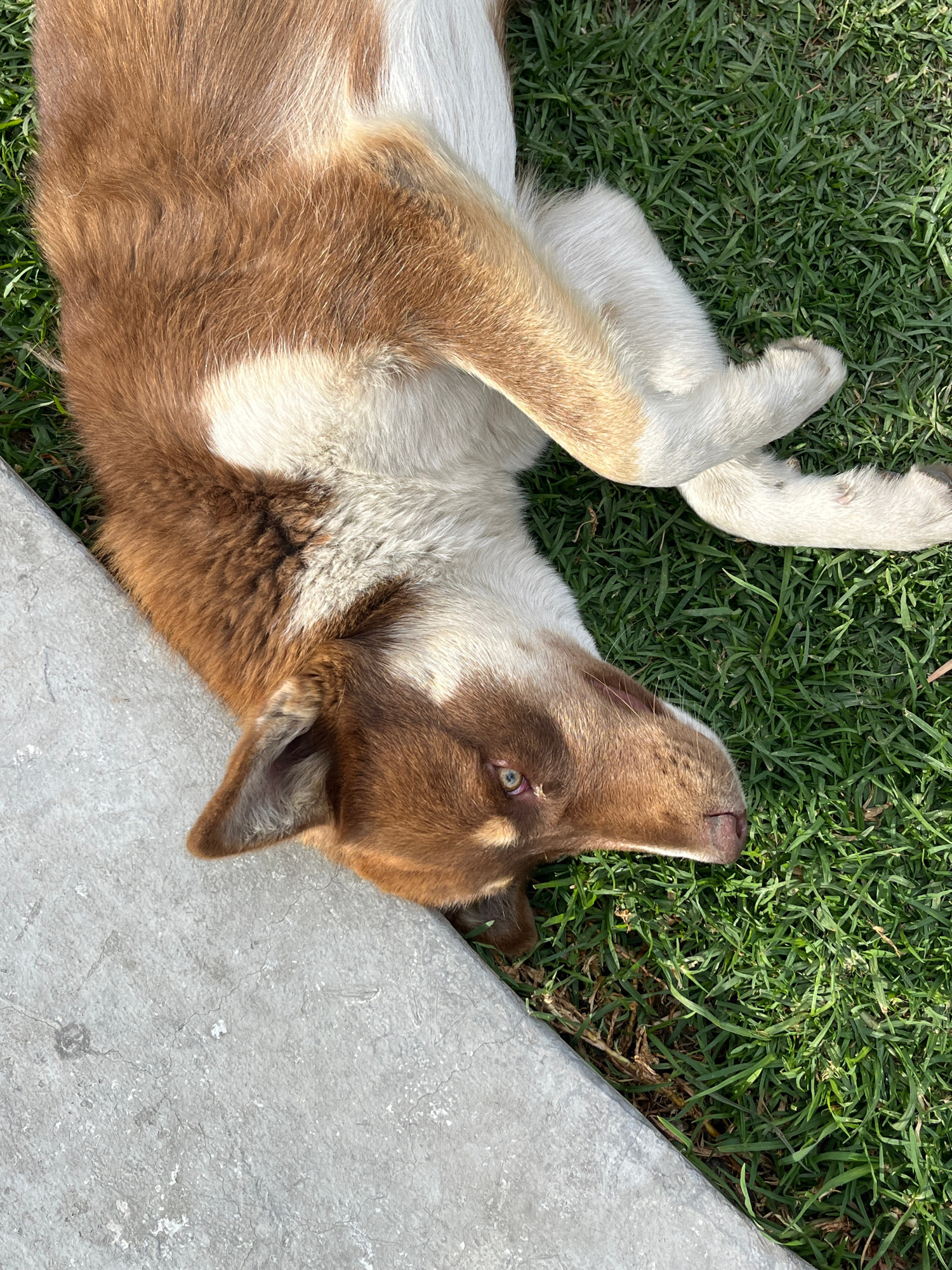 An overhead, close-up shot captures a medium-sized dog, distinguished by its brown and white fur, relaxing on a vibrant green lawn in La Paz, Bolivia. The dog is lying on its back, partially rolled on…read more