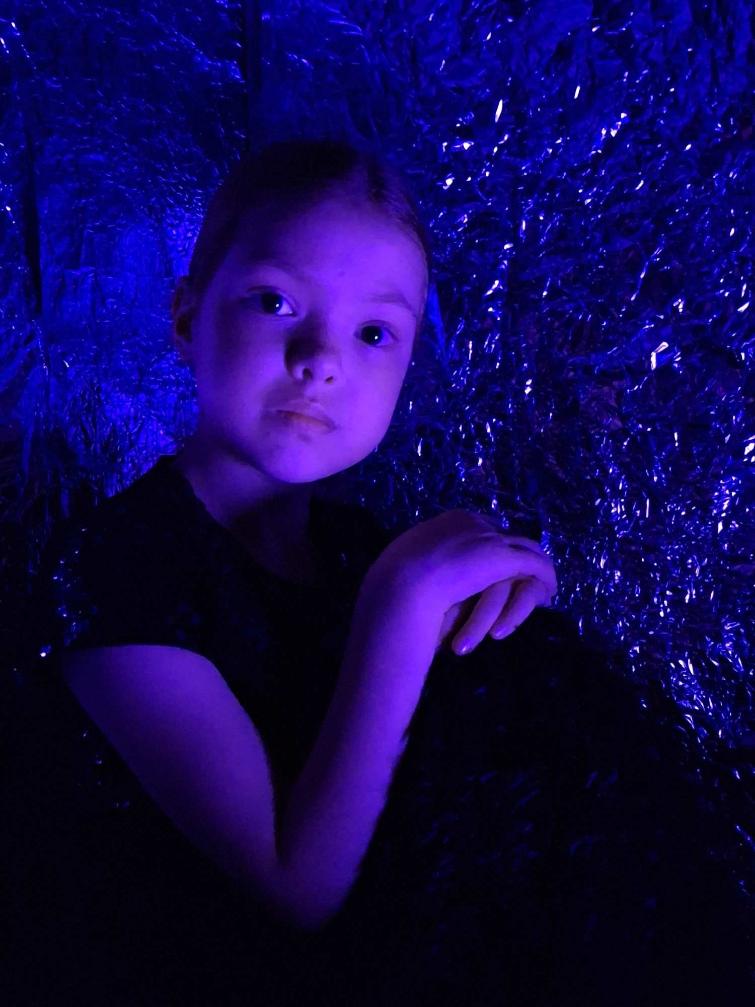 A child lies on a surface of crumpled foil or similar material. The scene is lit with a strong, blue light that casts deep shadows. The child is wearing a dark garment. Their hands are folded near the…read more