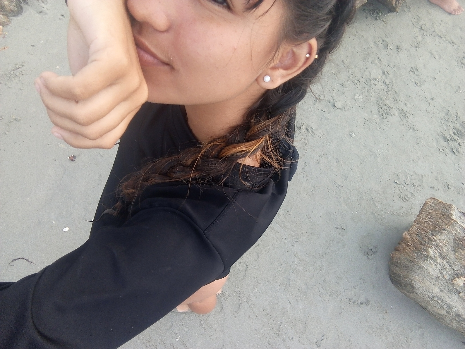 A woman is pictured outdoors on a sandy surface, possibly a beach in the city of Juan Griego, Venezuela. She is wearing a long-sleeved black garment and has braided hair with some blonde highlights vi…read more