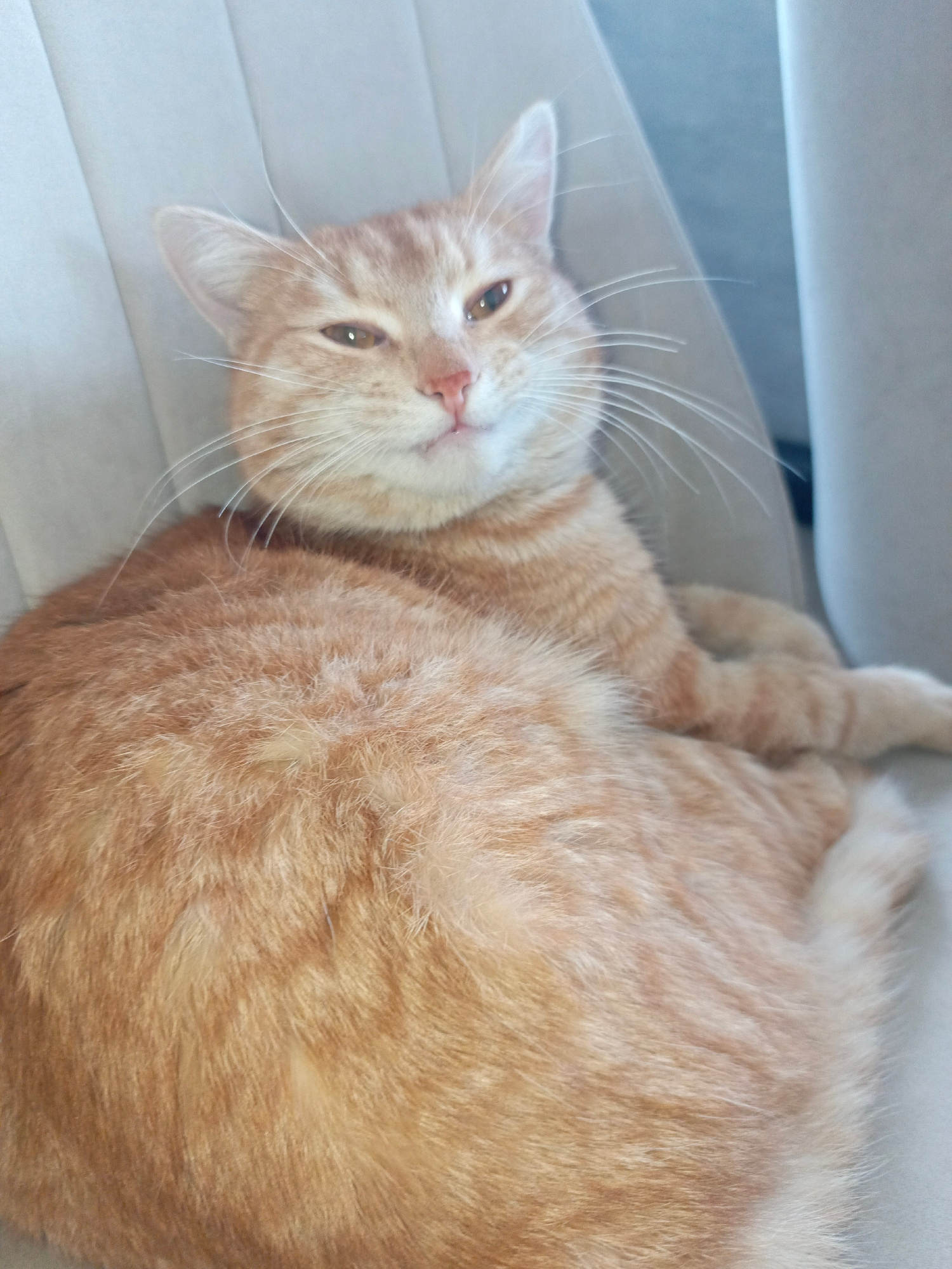 A medium-shot photograph depicts an orange tabby cat lying on a light gray, vertically-pleated surface, possibly a car seat. The cat's head is angled slightly to the right, with its eyes partially clo…read more